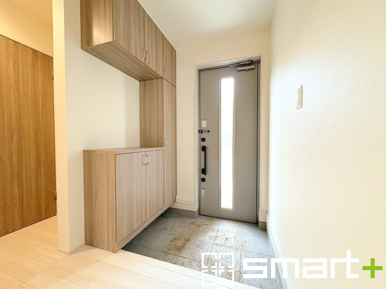 ~穏やかな陽が入る玄関~ ・玄関ドアにガラス部分を設ける事で穏やかな陽の入る玄関になります。 ・飾り棚としても演出できるコの字型のシューズボックスは大容量の収納力。