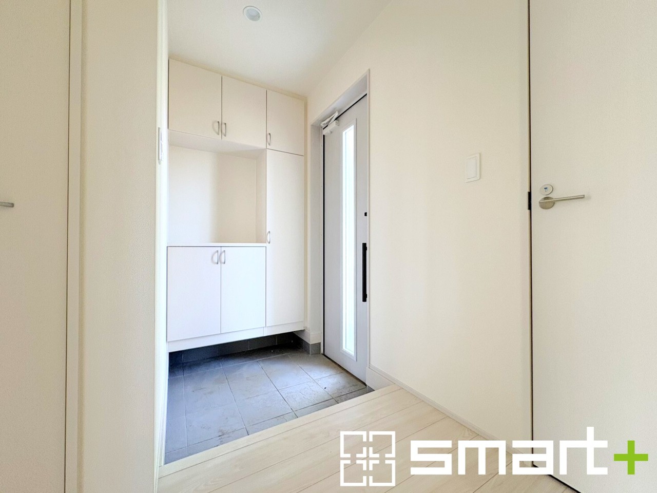 ~穏やかな陽が入る玄関~ ・玄関ドアにガラス部分を設ける事で穏やかな陽の入る玄関になります。 ・飾り棚としても演出できるコの字型のシューズボックスは大容量の収納力。