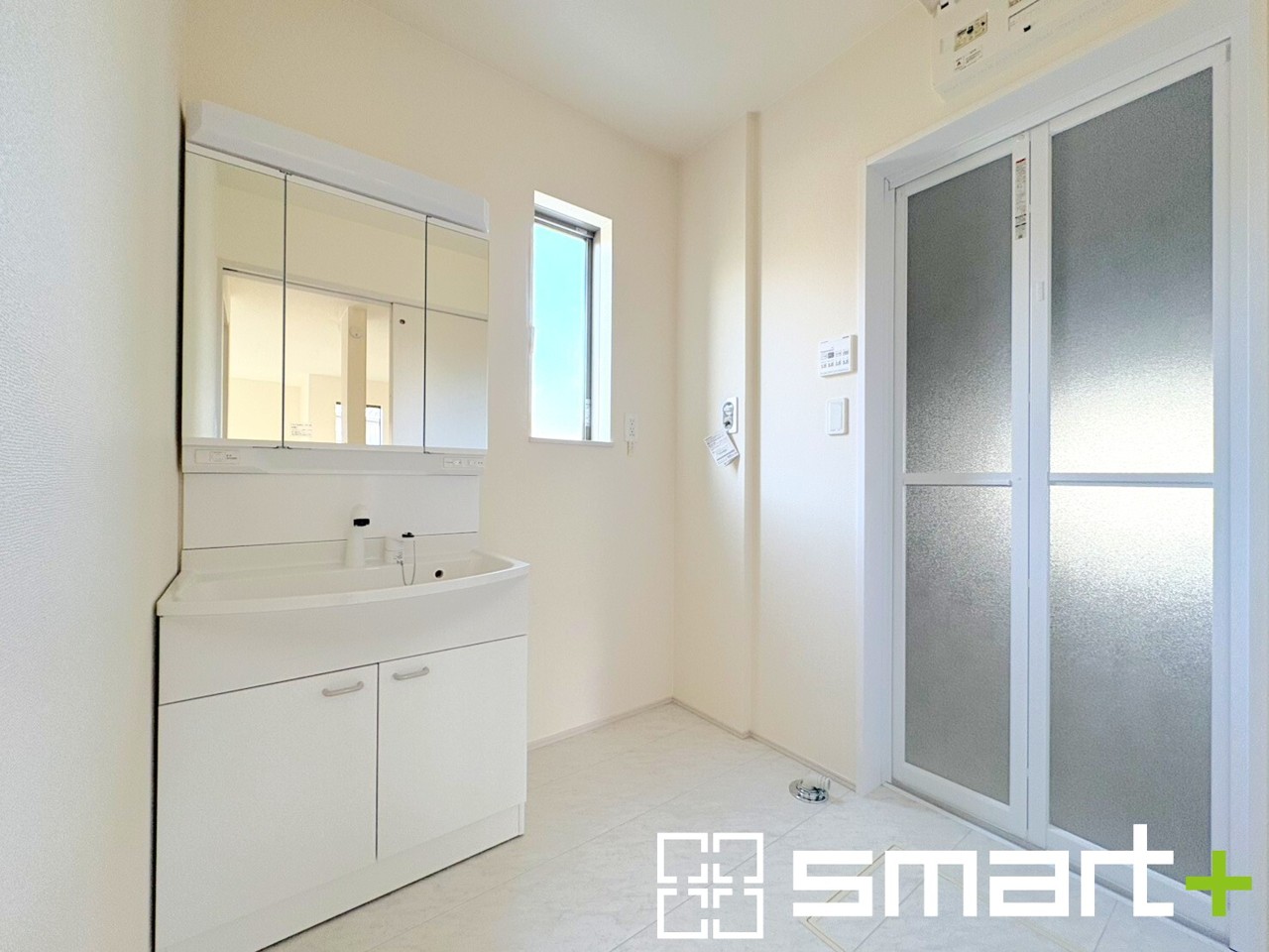 ~明るい洗面スペース~ ・窓から明るい陽が入り、気持ちよく朝の支度ができますね。 ・使い勝手の良い三面鏡タイプのシャワー付き洗面化粧台。鏡の裏に収納があるので洗面台周りもスッキリ。