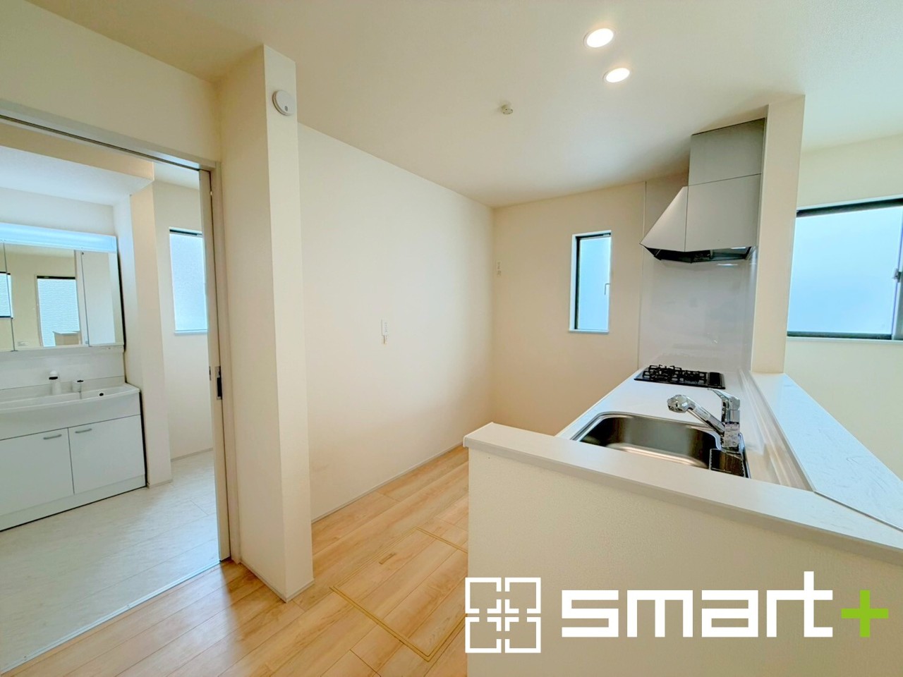 A号棟 ~水回り集中プランを採用~ ・キッチン・洗面など水回りを集中させることで家事のしやすい間取。 ・日々の事なので家事導線もご見学の際にぜひチェックしてみてください。