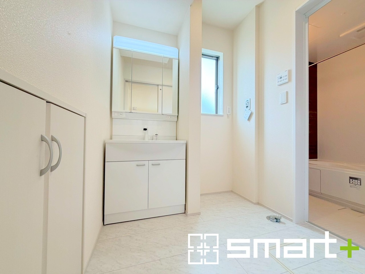 A号棟 ~明るい洗面スペース~ ・窓から明るい陽が入り、気持ちよく朝の支度ができますね。 ・使い勝手の良い三面鏡タイプのシャワー付き洗面化粧台。鏡の裏に収納があるので洗面台周りもスッキリ。