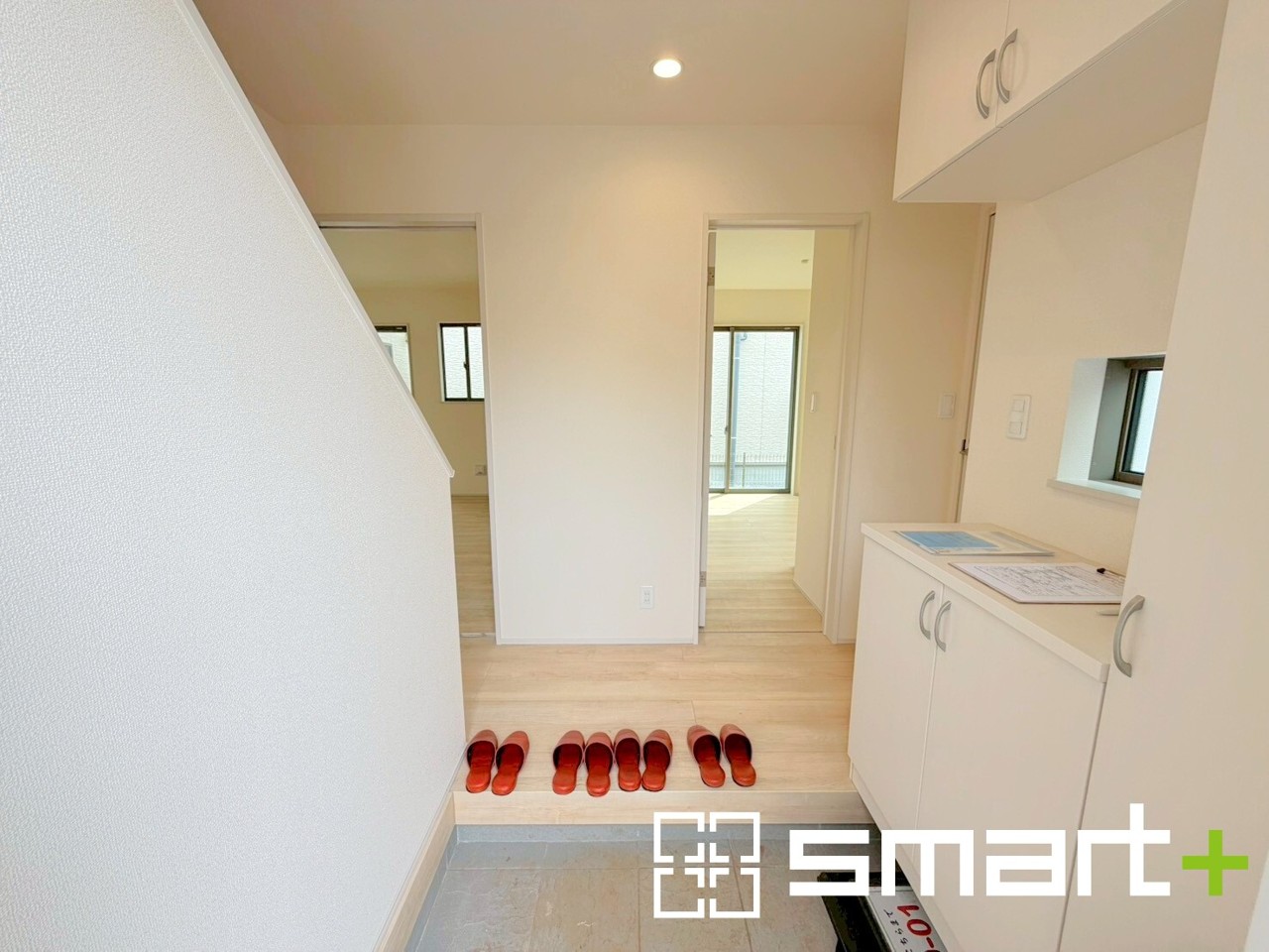 A号棟 ~ホワイトカラーで統一された玄関~ ・清潔感のあるホワイトカラーで纏められた玄関は圧迫感もなく広々とした印象に。 ・飾り棚としても演出できるコの字型のシューズボックスは大容量の収納力。
