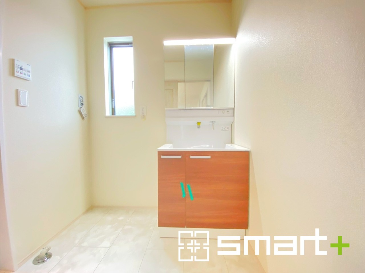 ~明るい洗面スペース~ ・窓から明るい陽が入り、気持ちよく朝の支度ができますね。 ・使い勝手の良い三面鏡タイプのシャワー付き洗面化粧台。鏡の裏に収納があるので洗面台周りもスッキリ。