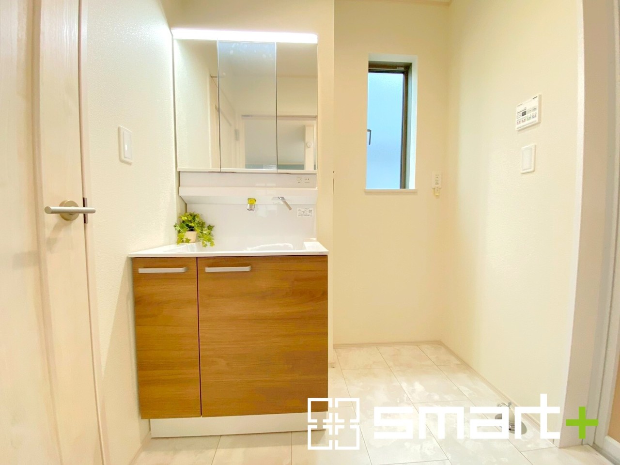 ~明るい洗面スペース~ ・窓から明るい陽が入り、気持ちよく朝の支度ができますね。 ・使い勝手の良い三面鏡タイプのシャワー付き洗面化粧台。鏡の裏に収納があるので洗面台周りもスッキリ。