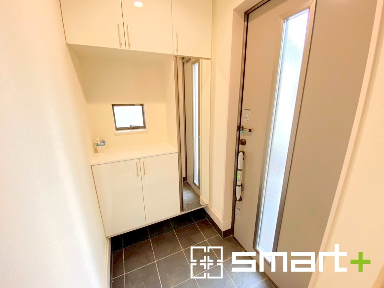 ~穏やかな陽が入る玄関~ ・窓に加えて玄関ドアのガラス部分からも穏やかな陽が入り、明るい玄関になります。 ・備え付けのシューズボックスはミラー付なのでお出かけ前のチェックに大活躍。