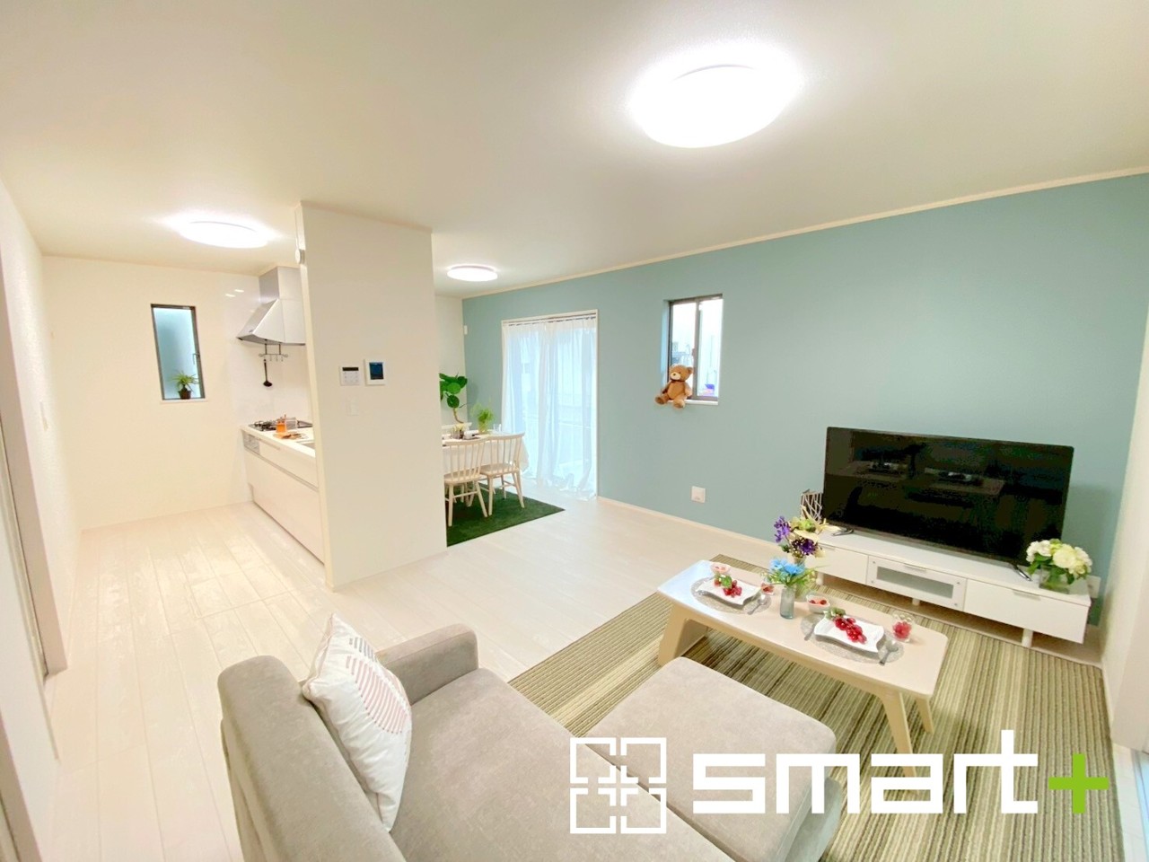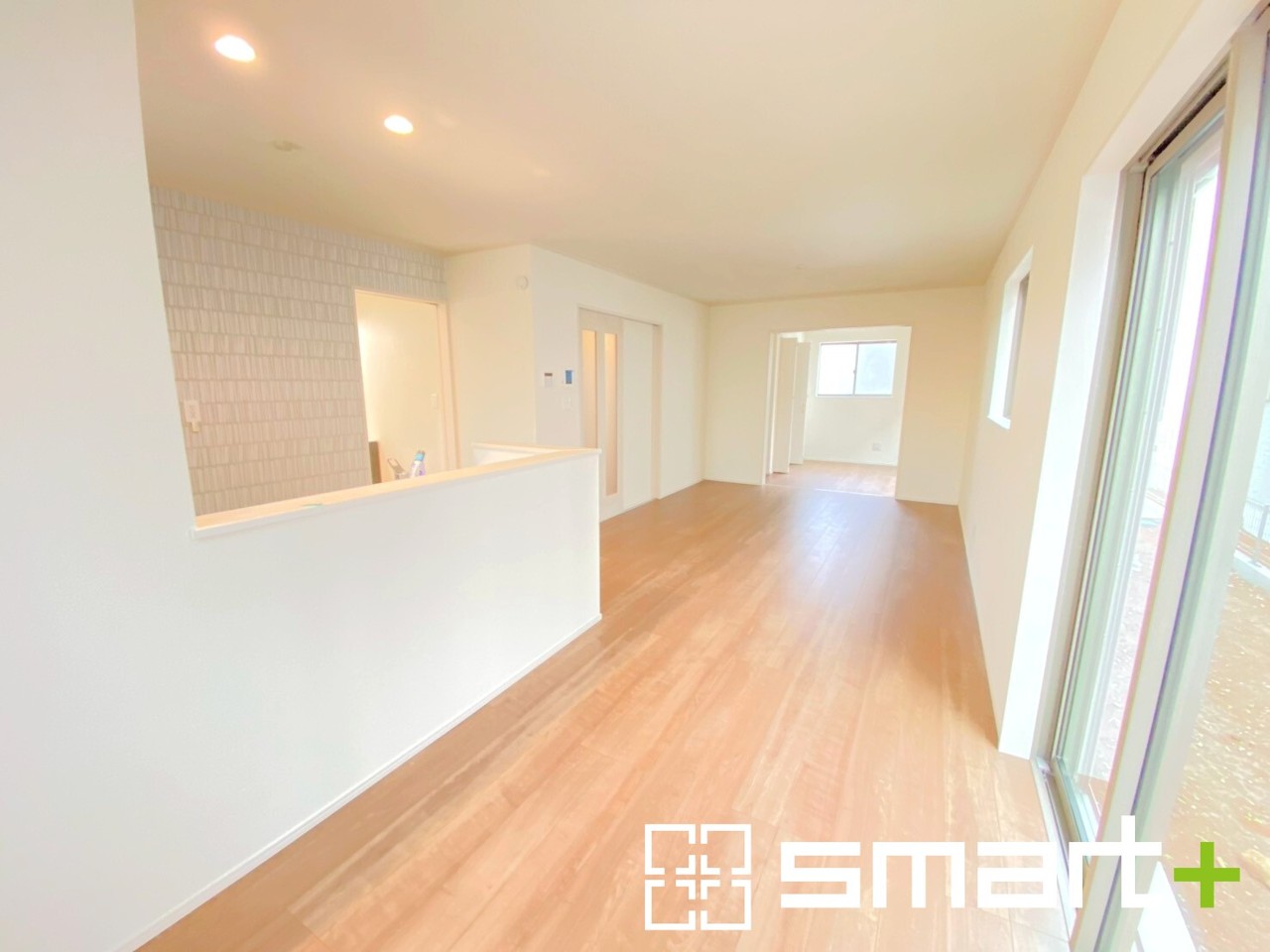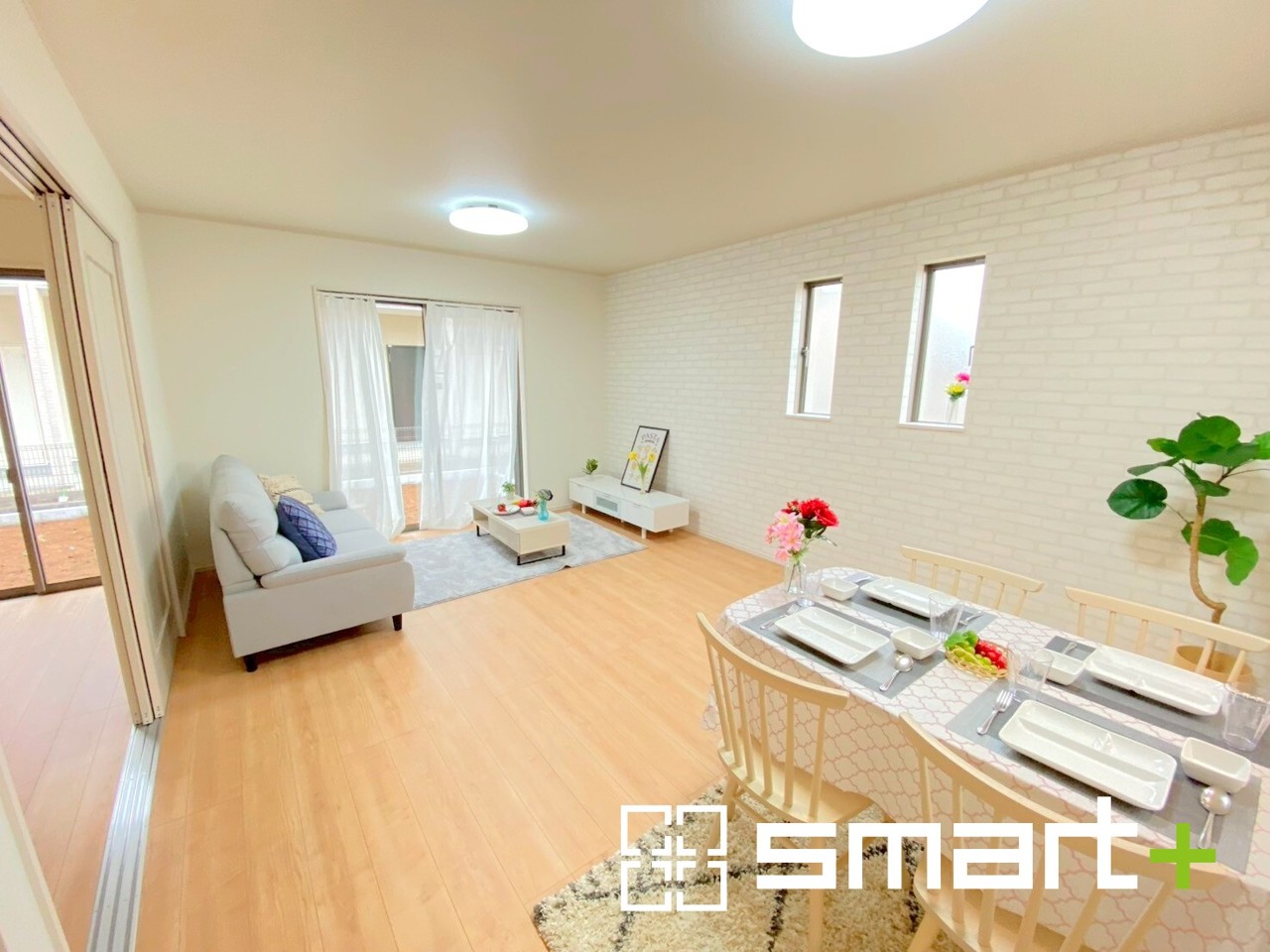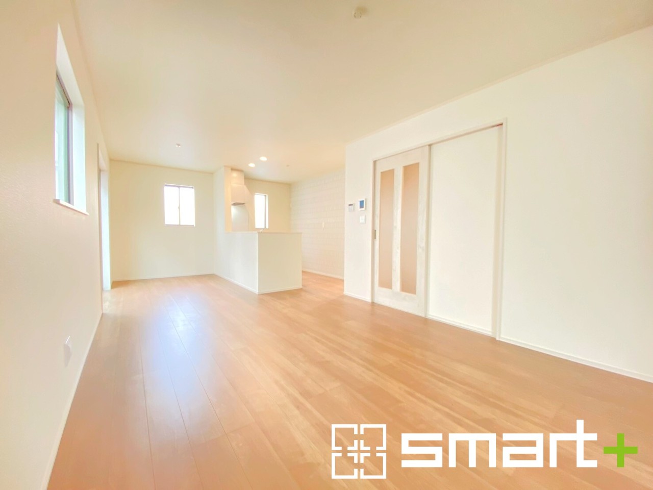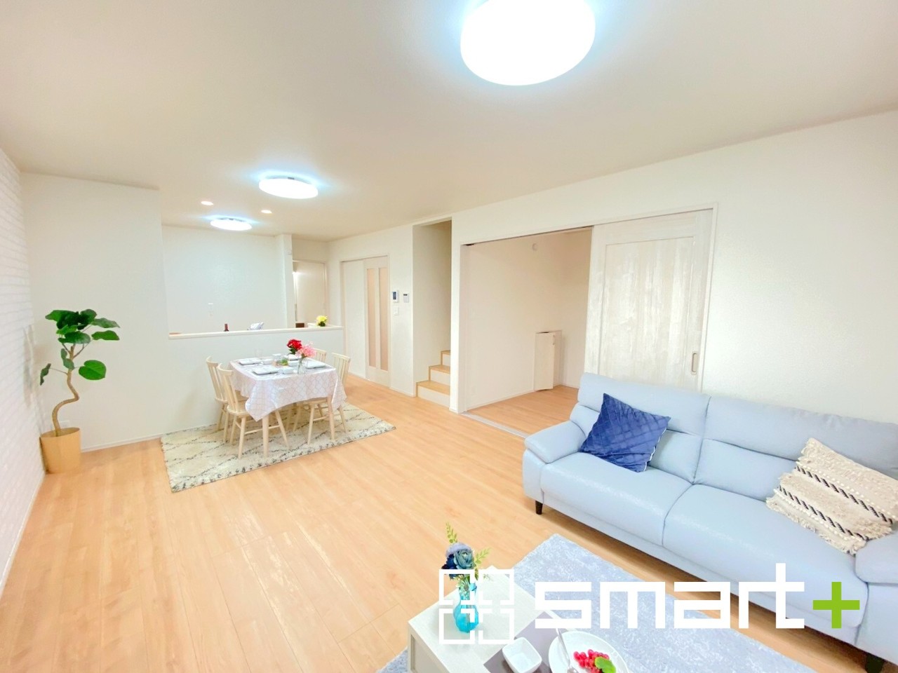 D号棟 ~家族団らんにピッタリの広々リビング~ ・穏やかな陽だまりに包まれる居心地の良いLDKは、ご家族が集まる憩いのスペースに。 ・隣接の洋室を続き間として利用すれば20帖超の広々空間になります。