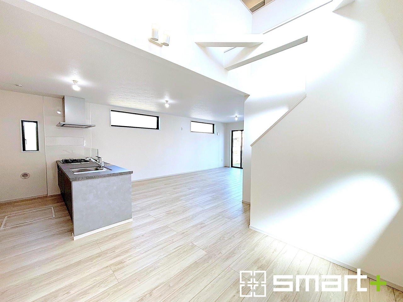 1号棟 ~吹抜けのあるLDK~ ・LDKに吹抜けを配する事で縦への空間が生まれ、開放感のある広々とした仕様に。 ・ご来客の際なども自慢できるような高級仕様のLDKとなっております。