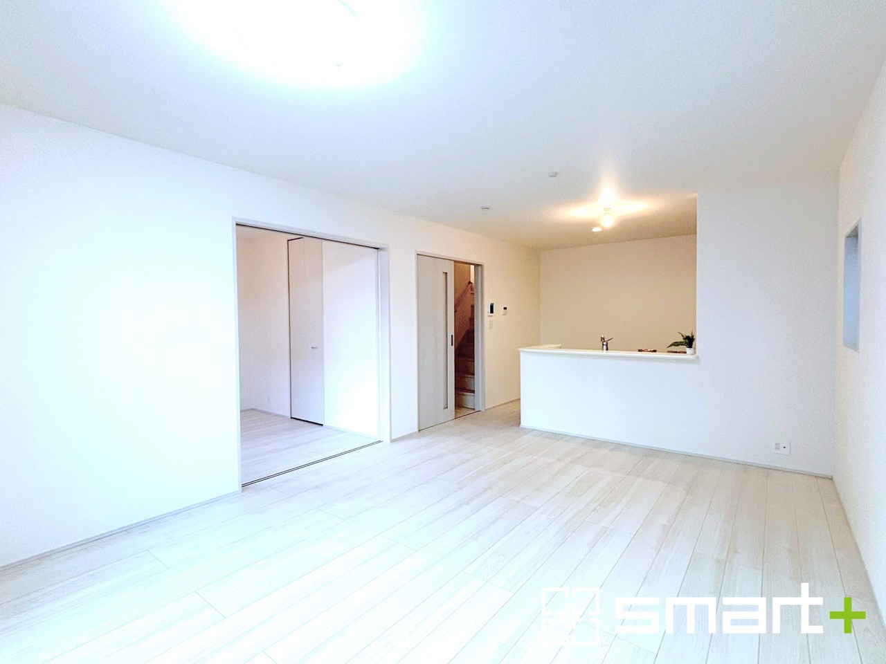 1号棟 ~穏やかな陽の入るLDK~ ・大きな窓のあるLDKは陽当りも良好で明るい空間となっております。 ・ご家族団らんなど過ごす時間の多いLDKが明るいのは嬉しいポイントですね。