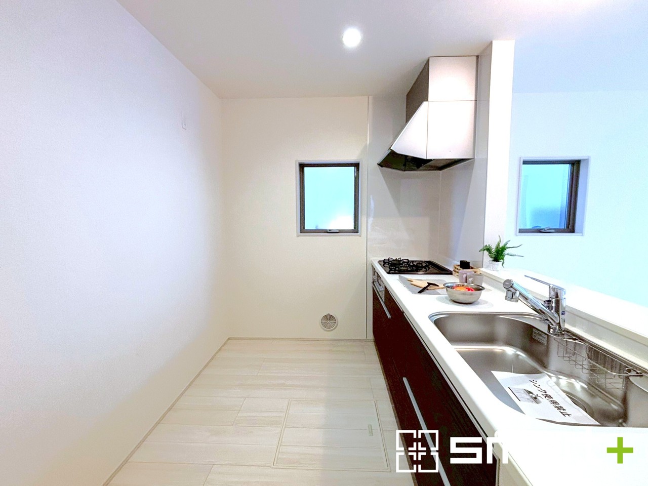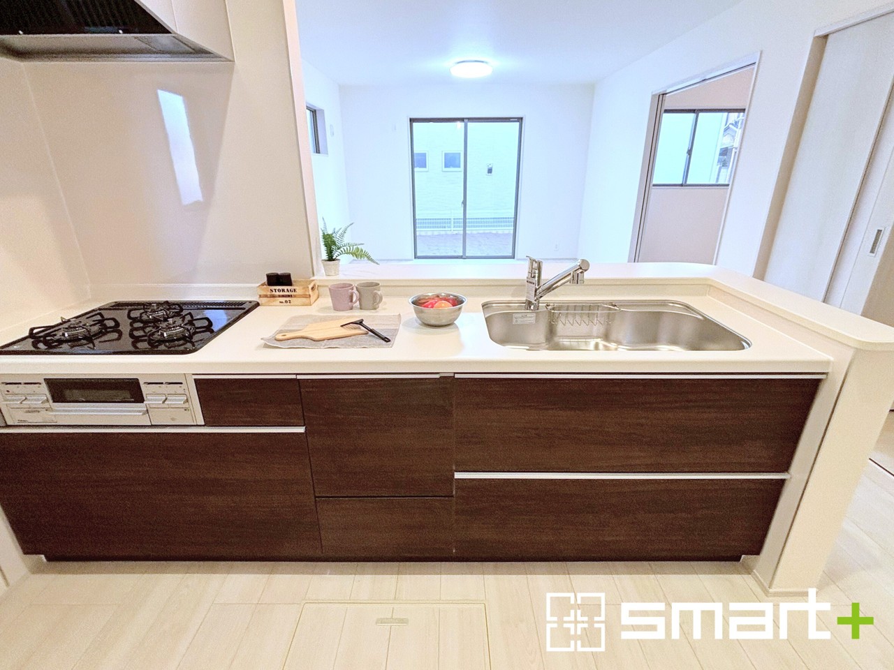 1号棟 ~使い勝手の良いシステムキッチン~ ・料理がしやすい設計のキッチンでお料理もはかどりますね。 ・もちろんキッチン下部は収納になっておりますので、フライパンなども収納可能です。
