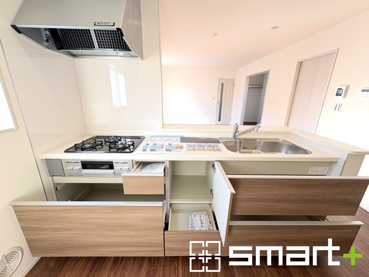 ~使い勝手の良いシステムキッチン~ ・料理がしやすい設計のキッチンでお料理もはかどりますね。 ・もちろんキッチン下部は収納になっておりますので、フライパンなども収納可能です。