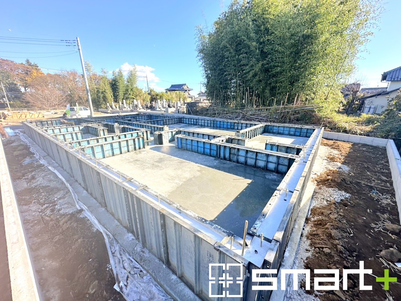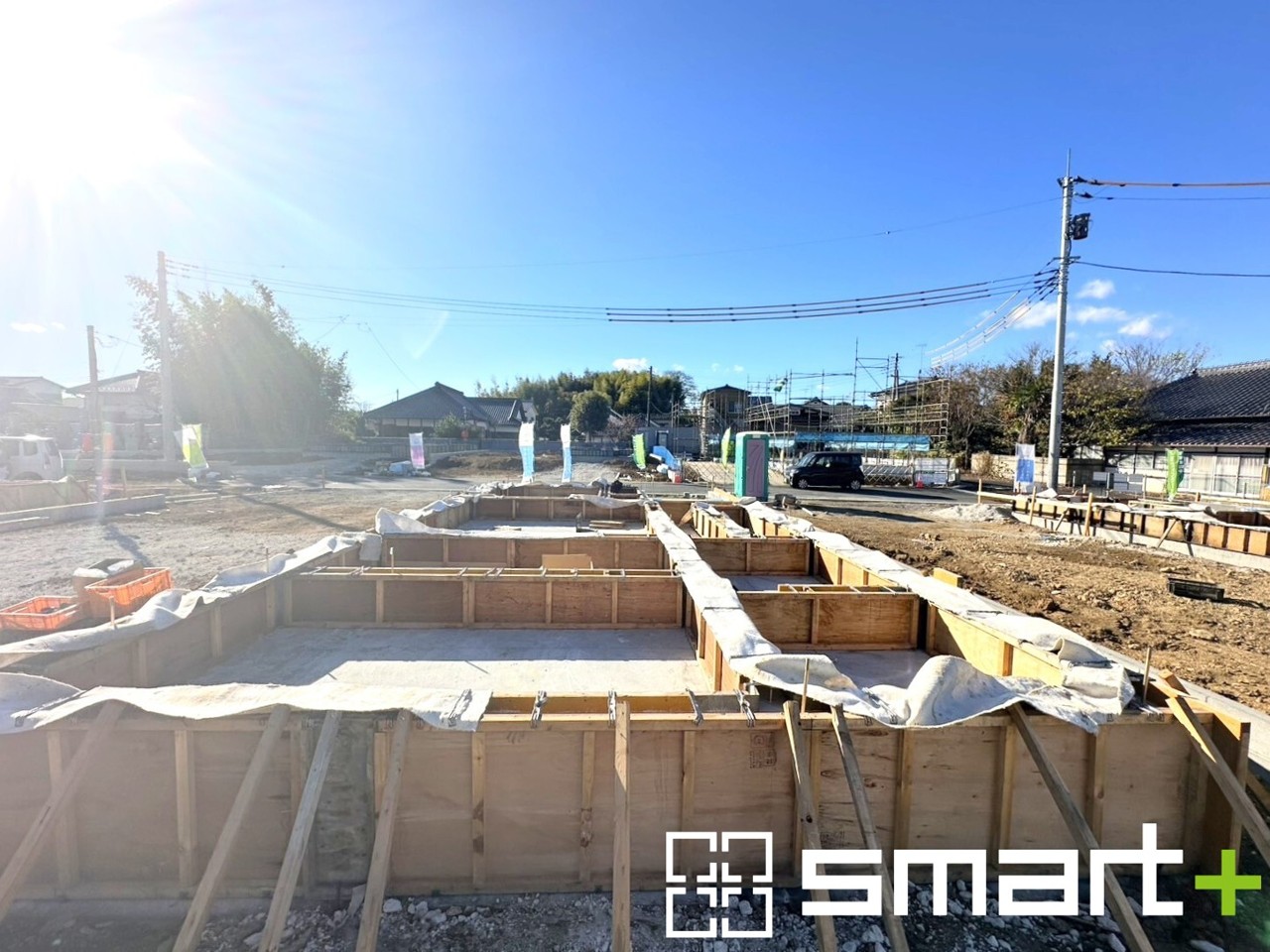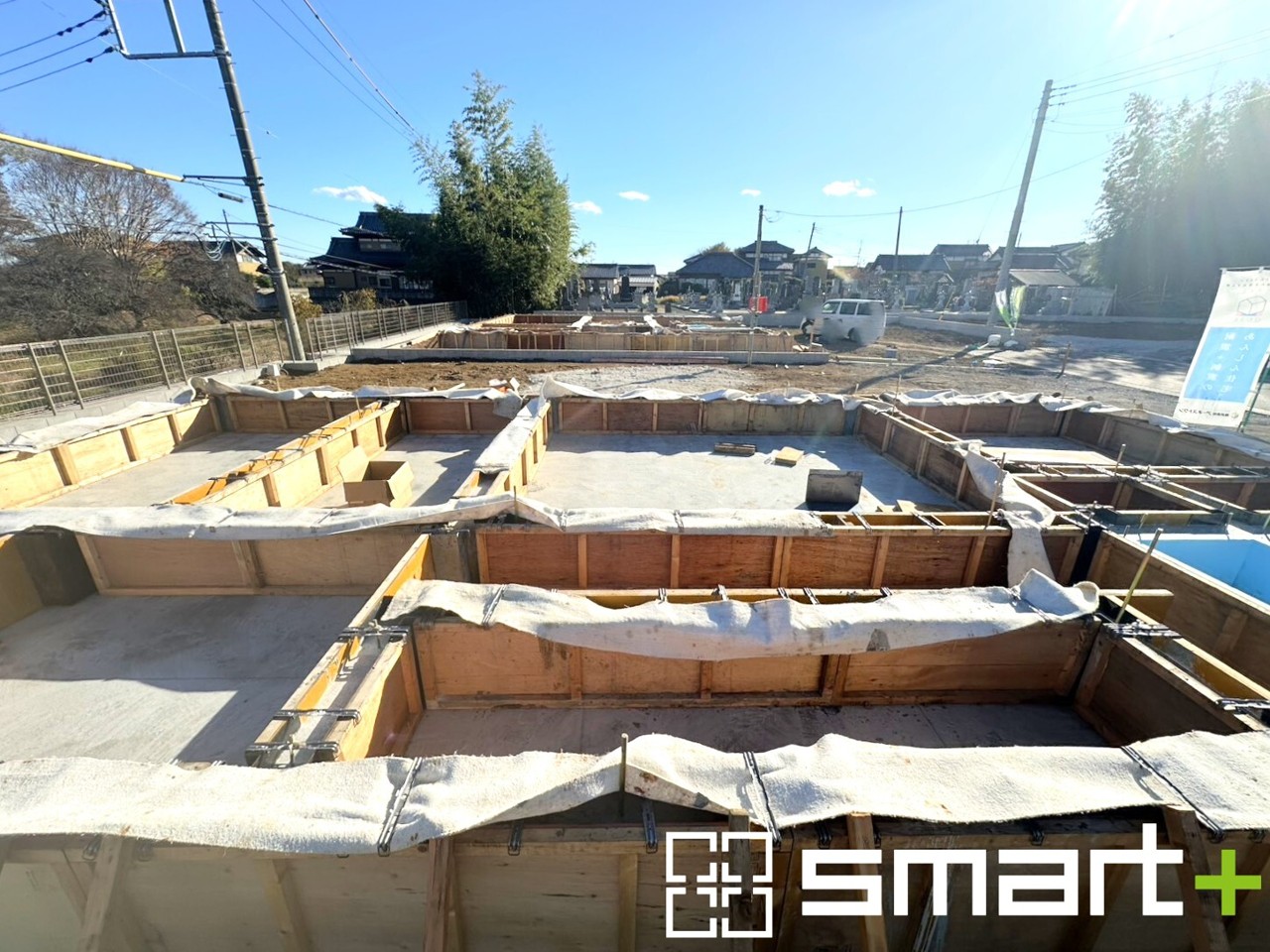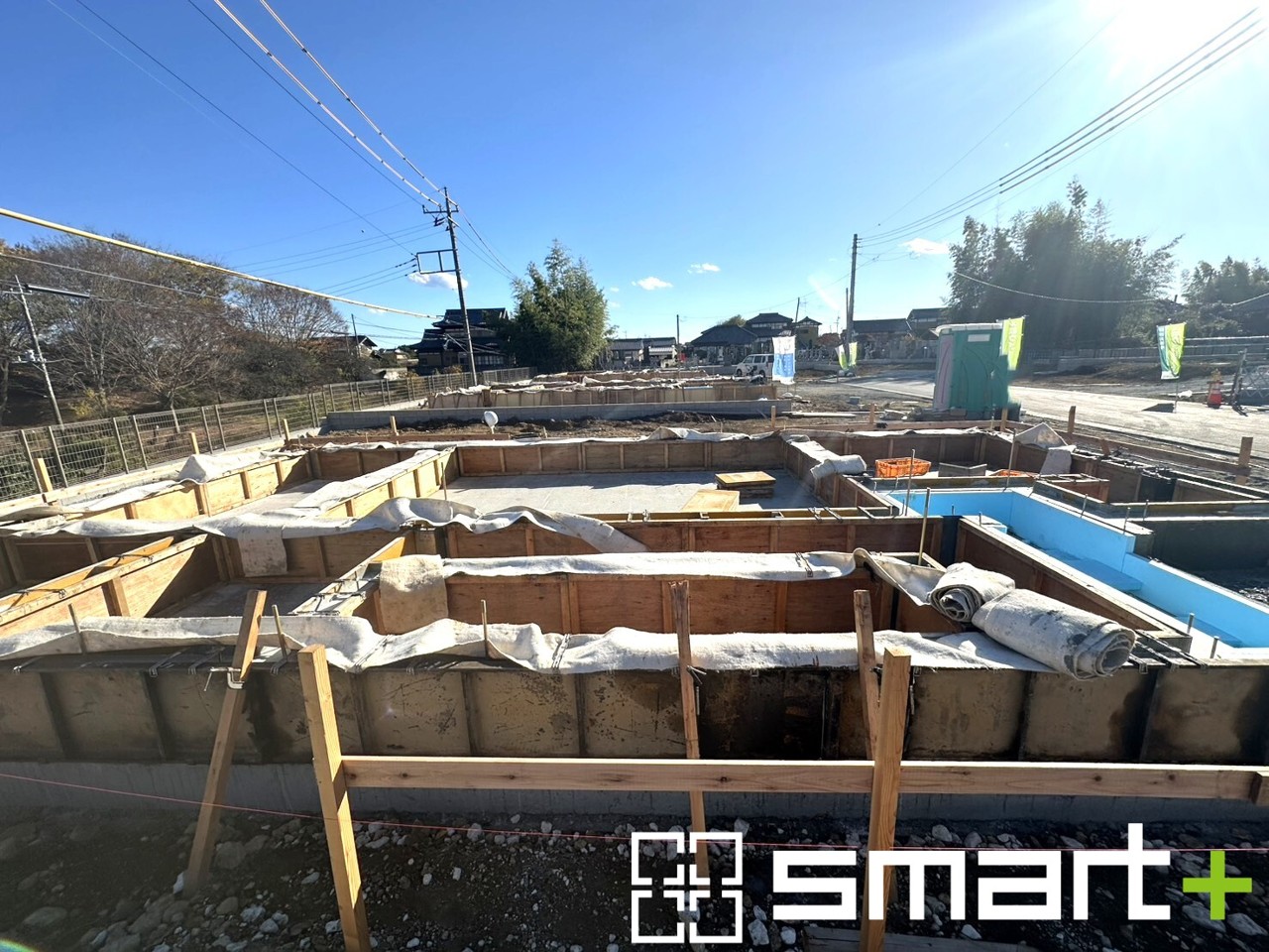 ~ベタ基礎でしっかりとした土台~ ・コンクリートの中に鉄筋を配し強度を高めた「ベタ基礎」を採用。 ・しっかりとした土台を造ったうえで、その上に建物が築造されていきます。 (1号棟)