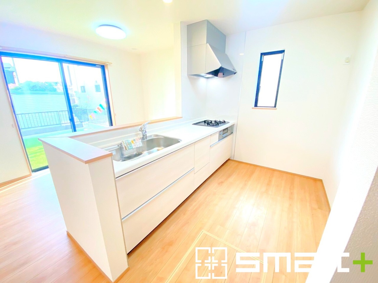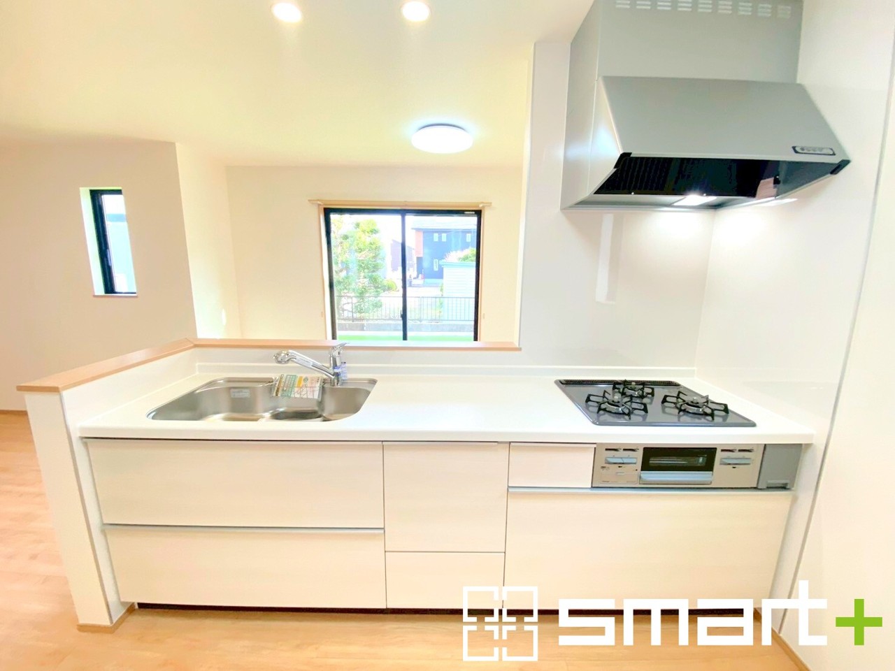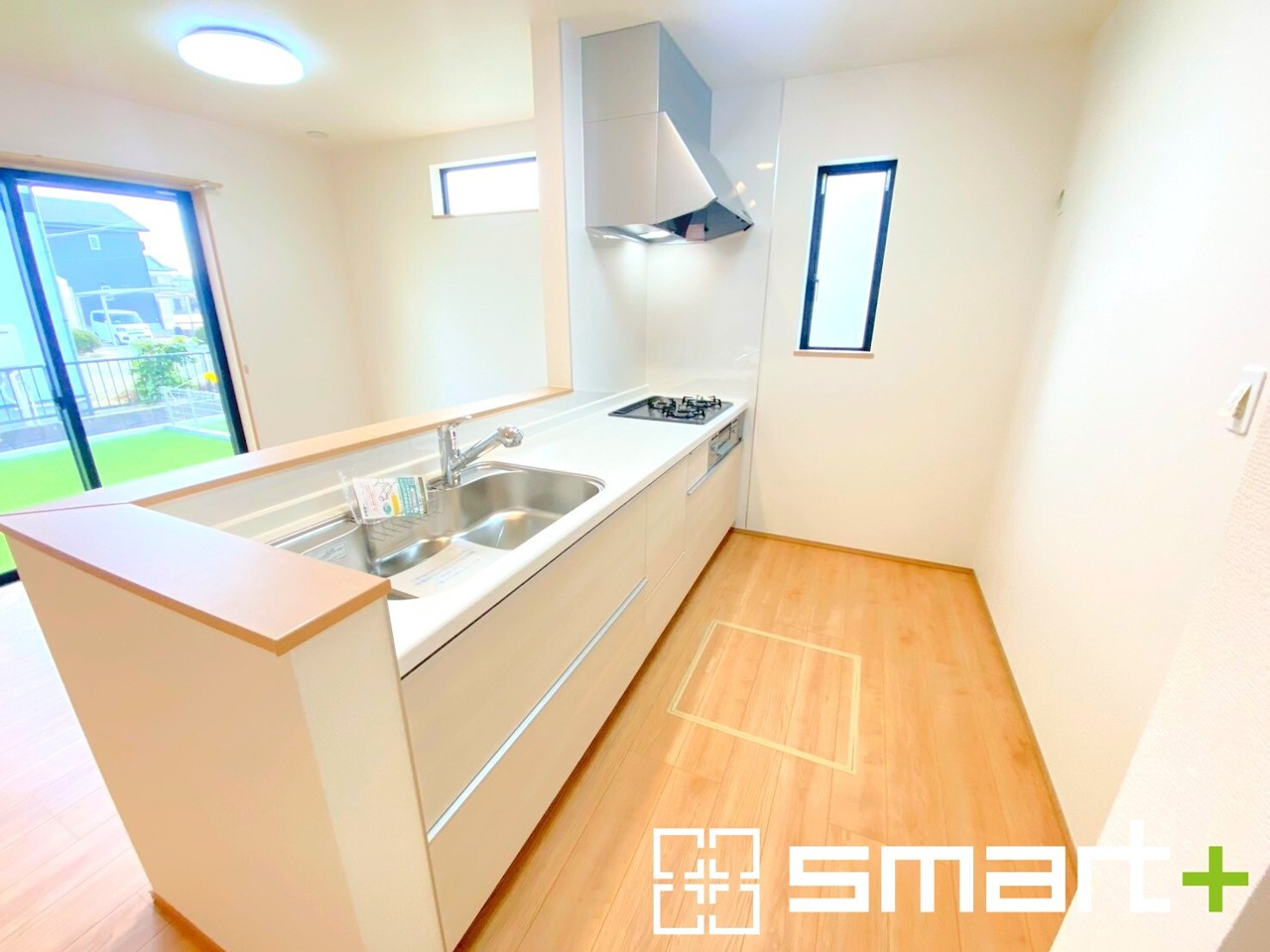 B号棟 ~人気のカウンターキッチン~ ・キッチンには余計な柱が無いので、リビングが見渡せ開放感のある造りとなっております。 ・蛇口には浄水器が内蔵されるなど機能面でも優れたキッチンです。