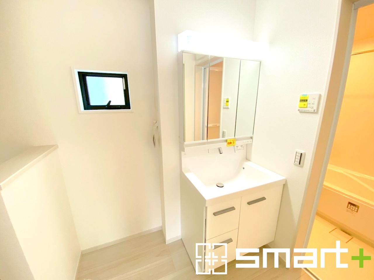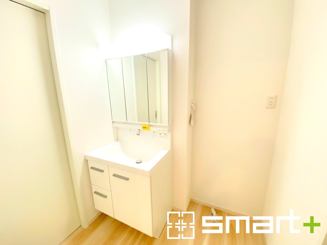 1号棟 ~人気の三面鏡を採用~ ・洗面台は三面鏡仕様なので鏡の角度を変える事で頭の後ろの方までご確認可能です。 ・鏡の裏が収納になっておりますので、洗面台周りもスッキリと片付きます。