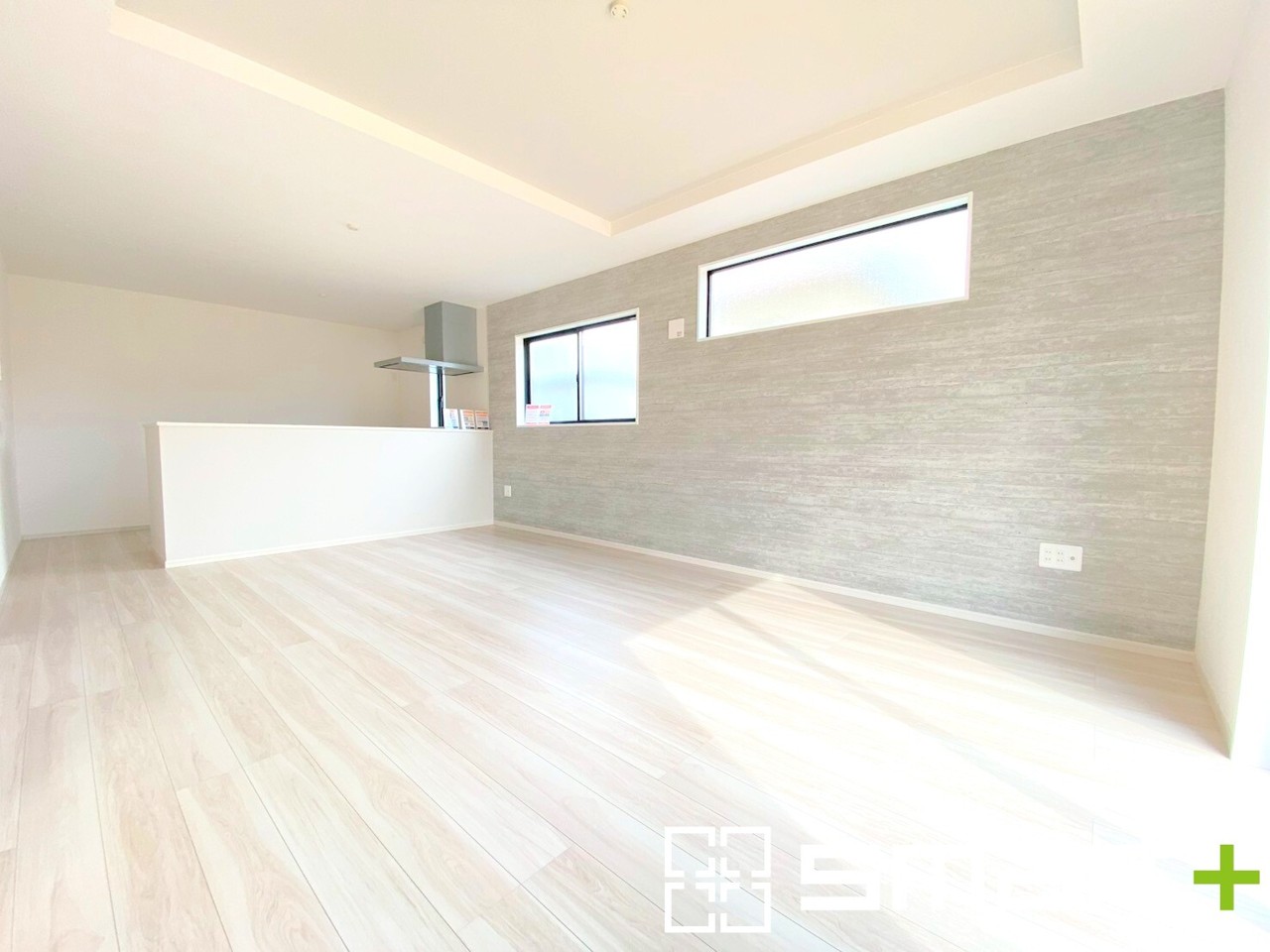 2号棟 ~折り上げ天井のあるLDK~ ・一部天井を高くする折り上げ天井を配する事で縦への空間が生まれ、開放感のある広々とした仕様に。 ・アクセントクロスでシンプルなお部屋もメリハリのある空間に。