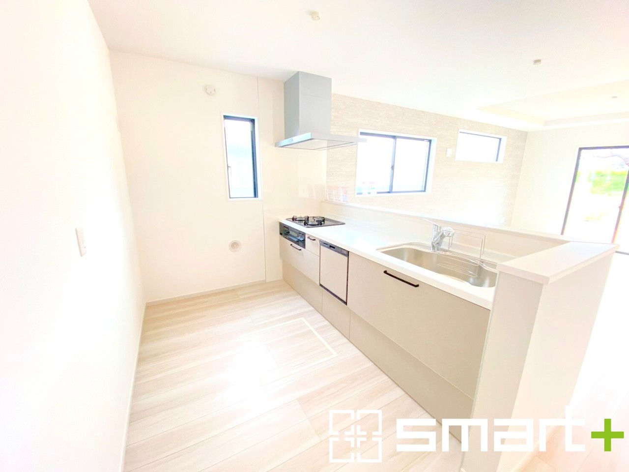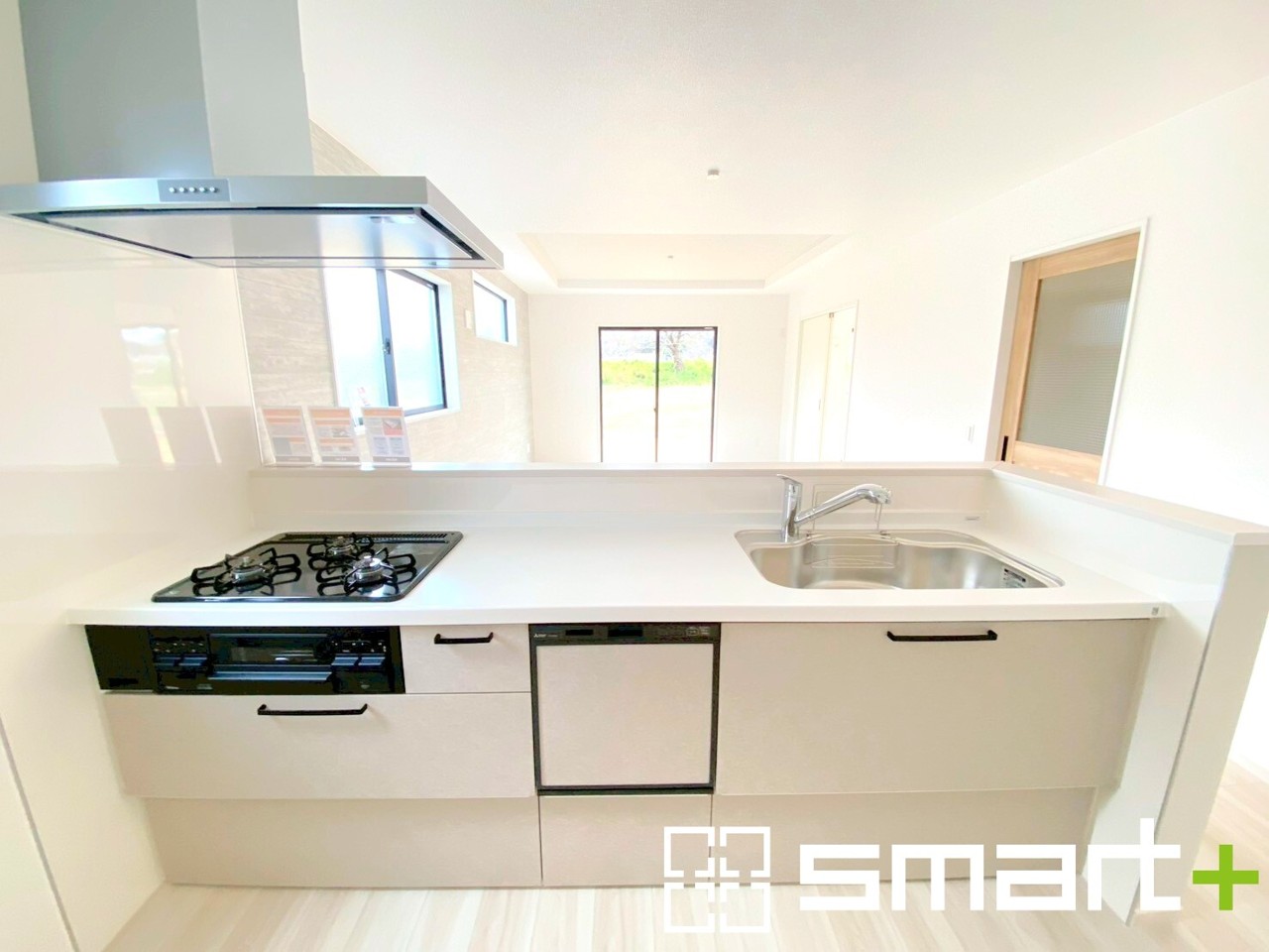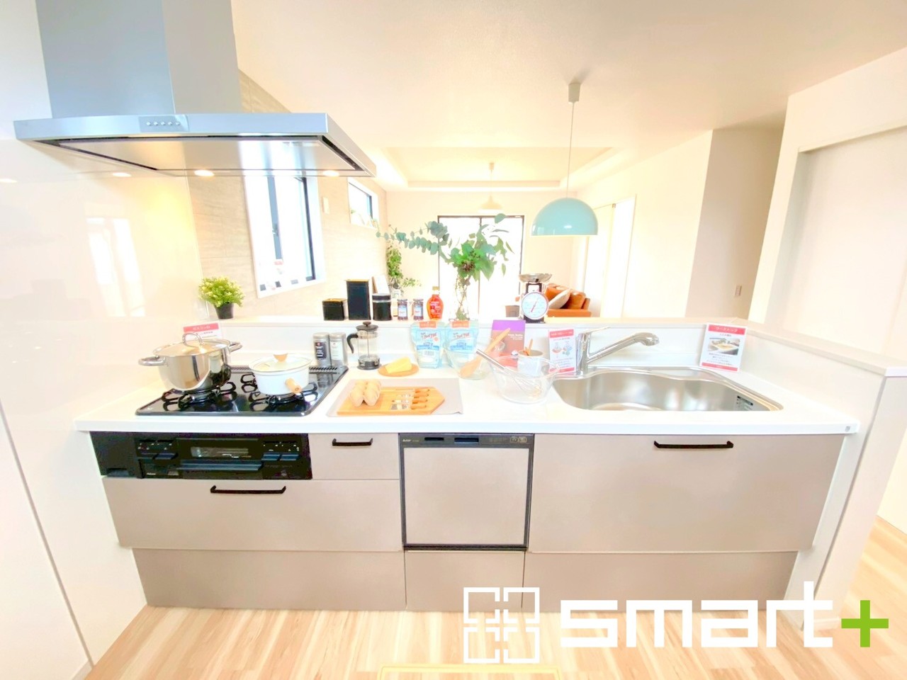 1号棟 ~使い勝手の良いシステムキッチン~ ・料理がしやすい設計のキッチンでお料理もはかどりますね。 ・もちろんキッチン下部は収納になっておりますので、フライパンなども収納可能です。
