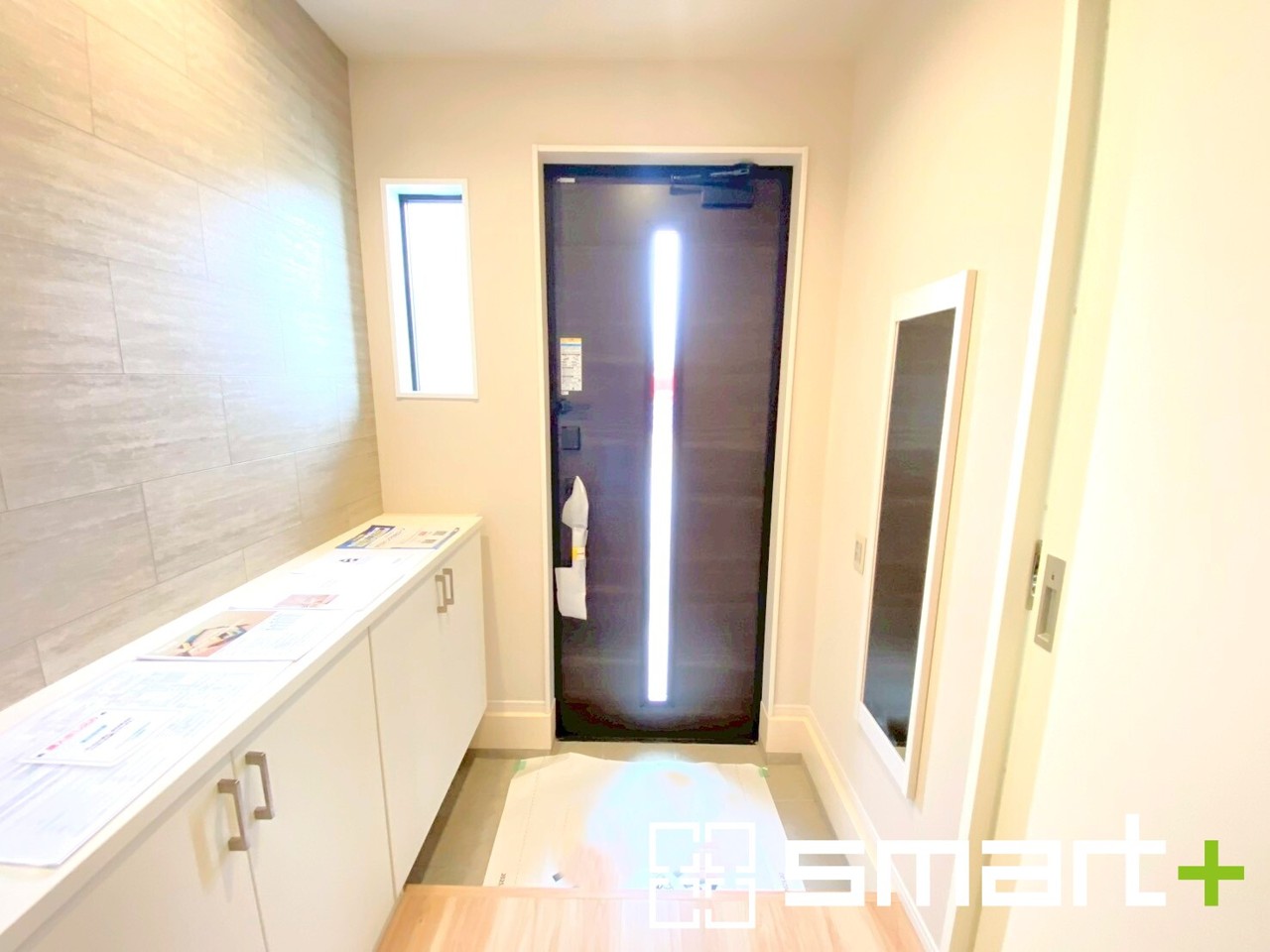 ~圧迫感のない明るい玄関~ ・窓に加えて玄関ドアのガラス部分からも穏やかな陽が入り、明るい玄関になります。 ・備え付けのシューズボックスはたっぷりしまえて玄関がスッキリ片付きますね。 (1号棟)
