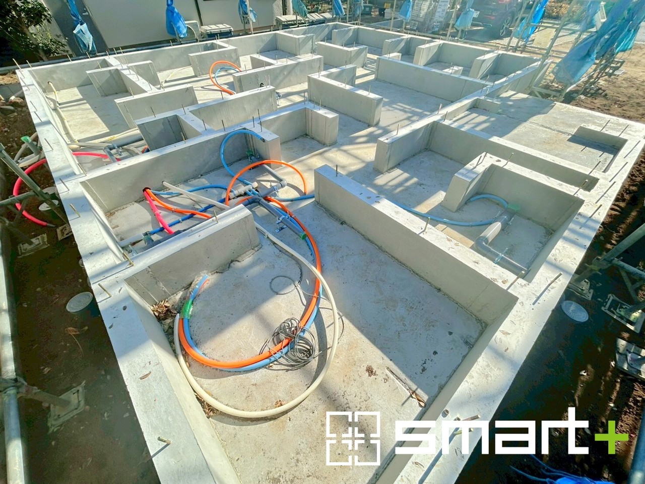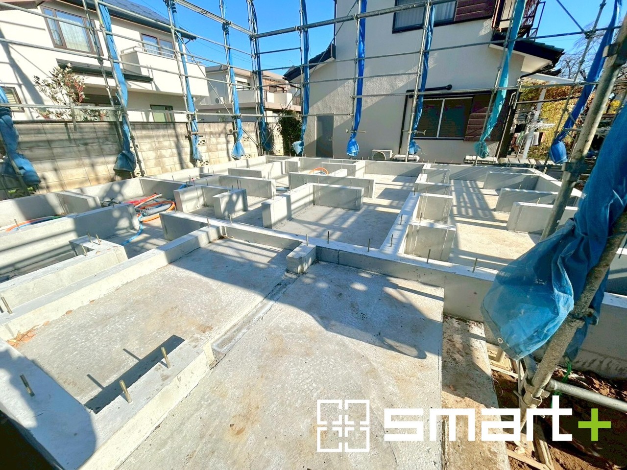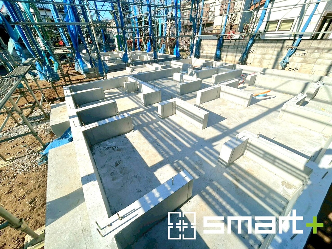 A号棟 ~ベタ基礎でしっかりとした土台~ ・コンクリートの中に鉄筋を配し強度を高めた「ベタ基礎」を採用。 ・しっかりとした土台を造ったうえで、その上に建物が築造されていきます。