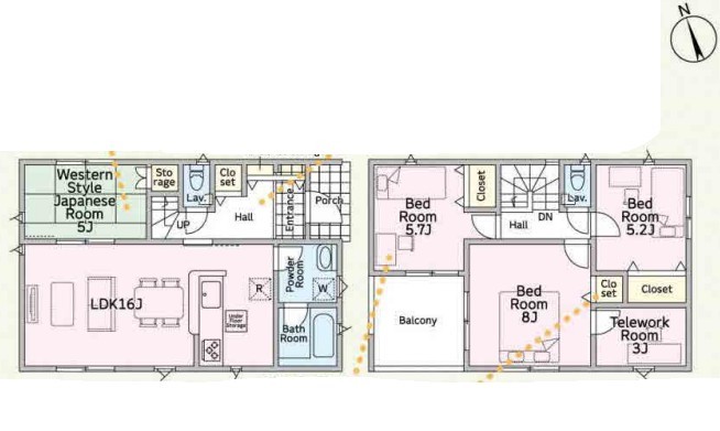 | 間取 | 4LDK + テレワークルーム3帖 (LDK16帖、洋室8帖、洋室5.7帖、洋室5.23帖、和室5帖) | ||