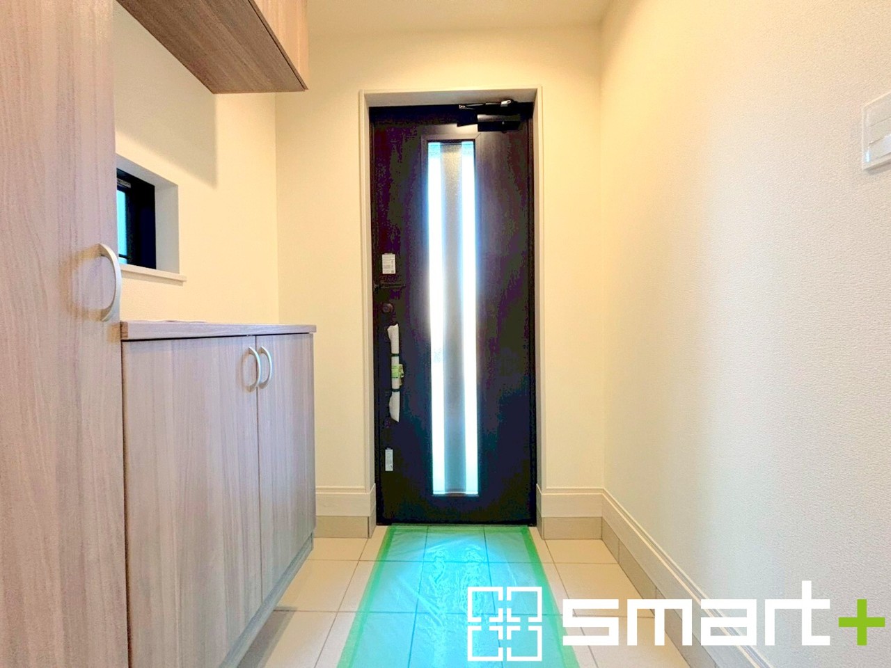 ~穏やかな陽が入る玄関~ ・玄関ドアにガラス部分を設ける事で穏やかな陽の入る玄関になります。 ・飾り棚としても演出できるコの字型の下駄箱は大容量の収納力。