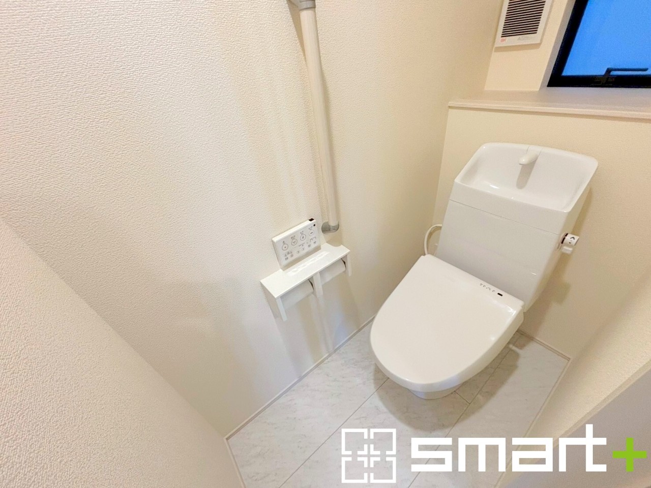 ~窓付きの明るいトイレ~ ・清潔感あるシャワートイレ。窓があるので換気もしやすく快適ですね。 ・背面にある棚はトイレットペーパーなどの置き場や飾り棚としても利用できますね。