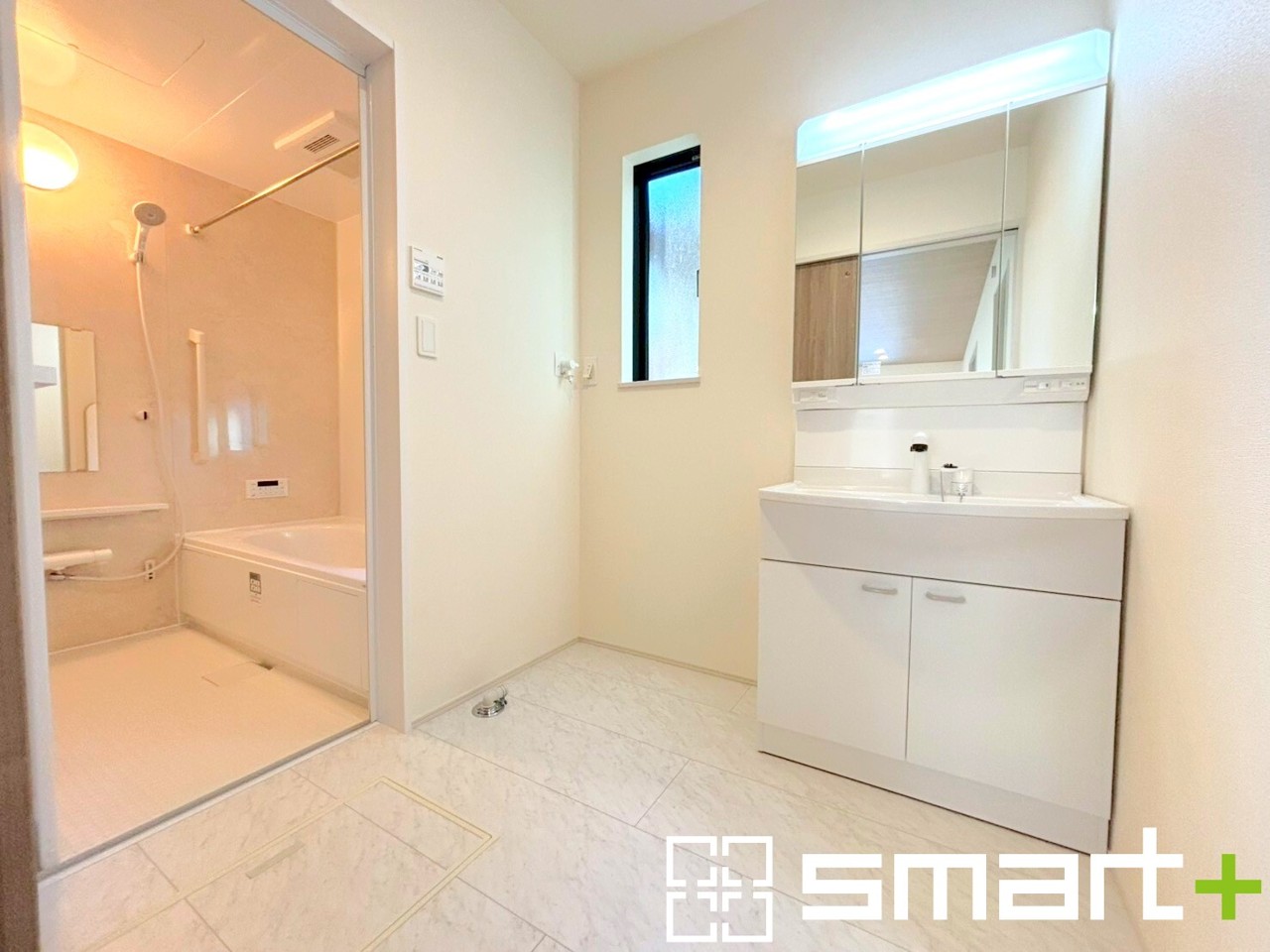 ~明るい洗面スペース~ ・窓から明るい陽が入り、気持ちよく朝の支度ができますね。 ・使い勝手の良い三面鏡タイプのシャワー付き洗面化粧台。鏡の裏に収納があるので洗面台周りもスッキリ。
