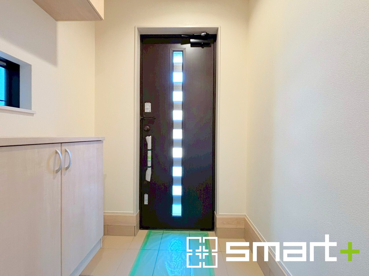~穏やかな陽が入る玄関~ ・玄関ドアにガラス部分を設ける事で穏やかな陽の入る玄関になります。 ・飾り棚としても演出できるコの字型の下駄箱は大容量の収納力。