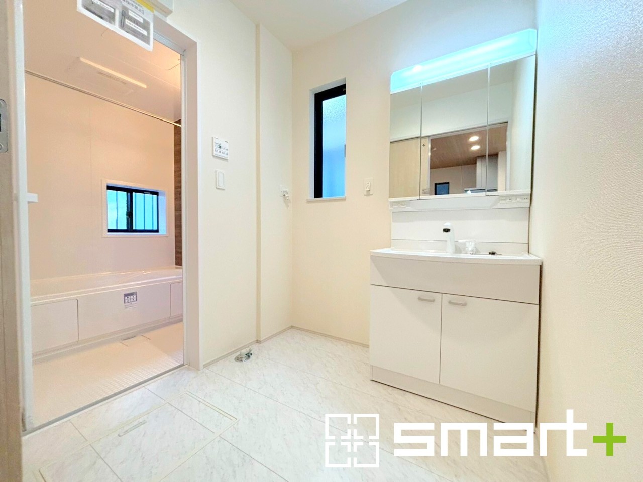 ~明るい洗面スペース~ ・窓から明るい陽が入り、気持ちよく朝の支度ができますね。 ・使い勝手の良い三面鏡タイプのシャワー付き洗面化粧台。鏡の裏に収納があるので洗面台周りもスッキリ。