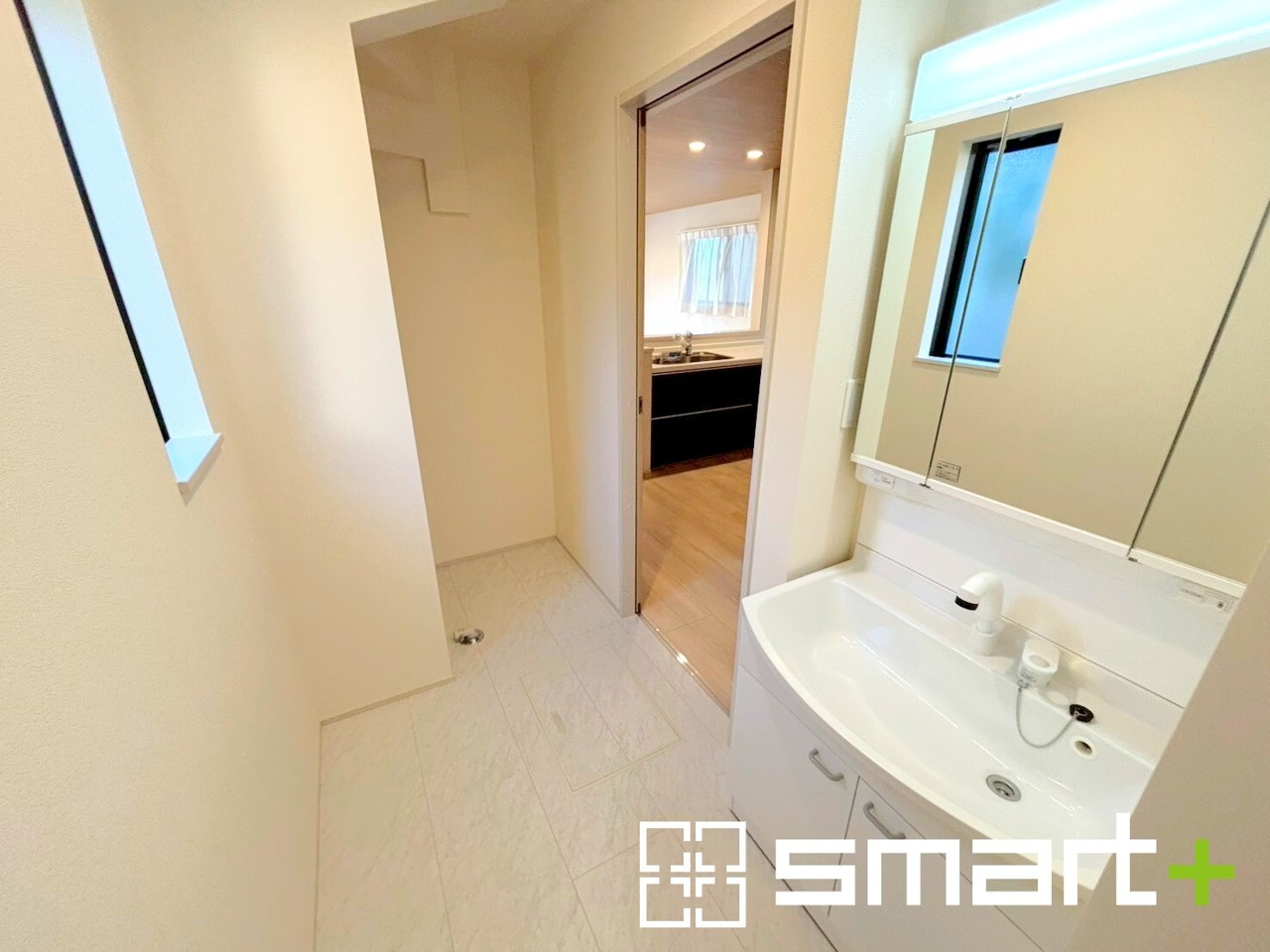 ~明るい洗面スペース~ ・窓から明るい陽が入り、気持ちよく朝の支度ができますね。 ・使い勝手の良い三面鏡タイプのシャワー付き洗面化粧台。鏡の裏に収納があるので洗面台周りもスッキリ。