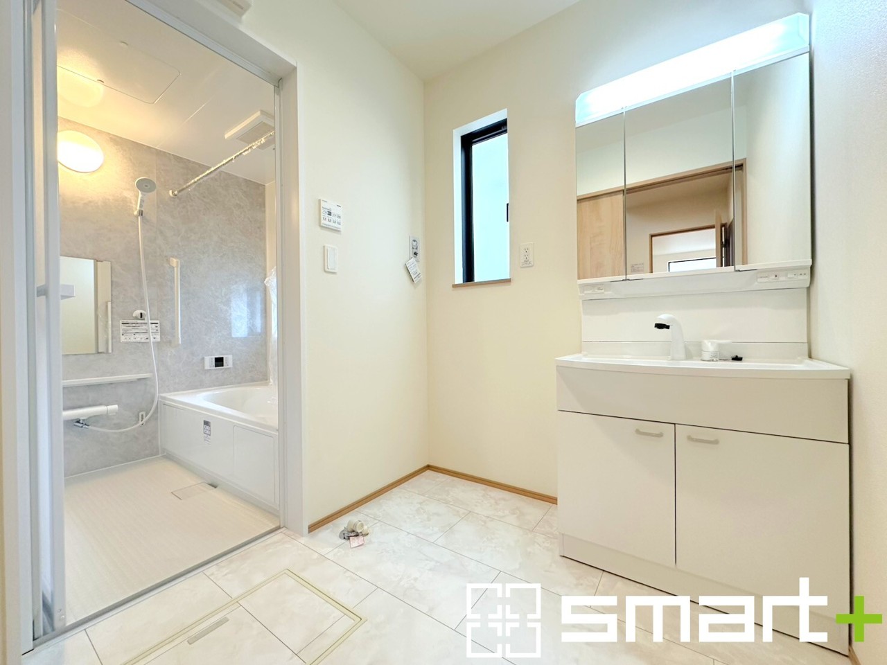 ~明るい洗面スペース~ ・窓から明るい陽が入り、気持ちよく朝の支度ができますね。 ・使い勝手の良い三面鏡タイプのシャワー付き洗面化粧台。鏡の裏に収納があるので洗面台周りもスッキリ。