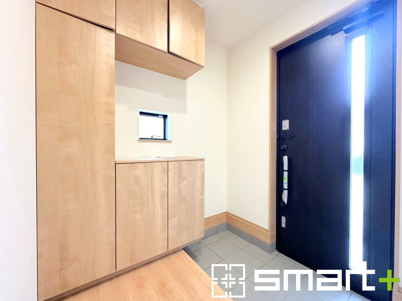 ~穏やかな陽が入る玄関~ ・窓に加えて玄関ドアのガラス部分からも穏やかな陽が入り、明るい玄関になります。 ・飾り棚としても演出できるコの字型のシューズボックスは大容量の収納力。