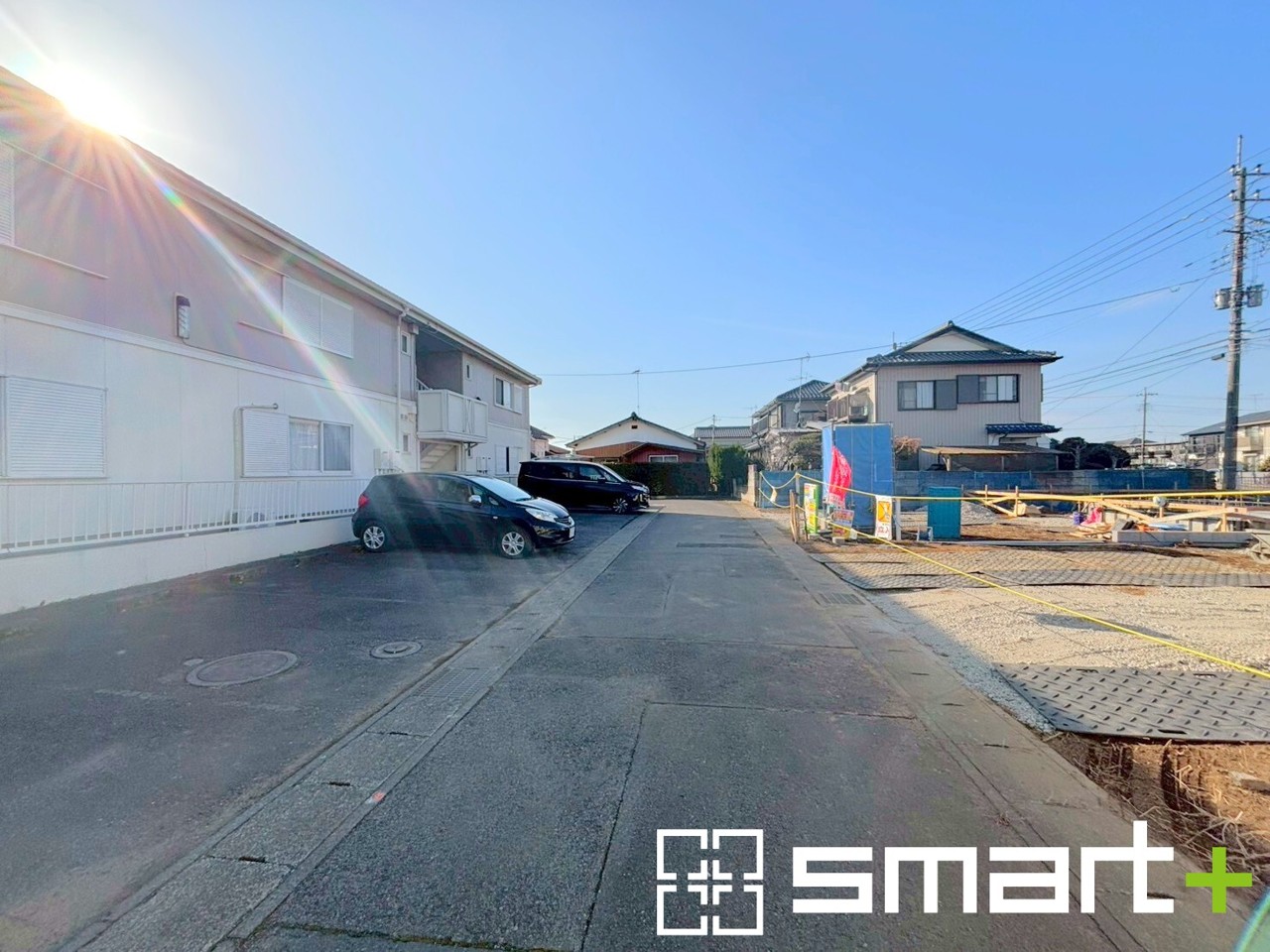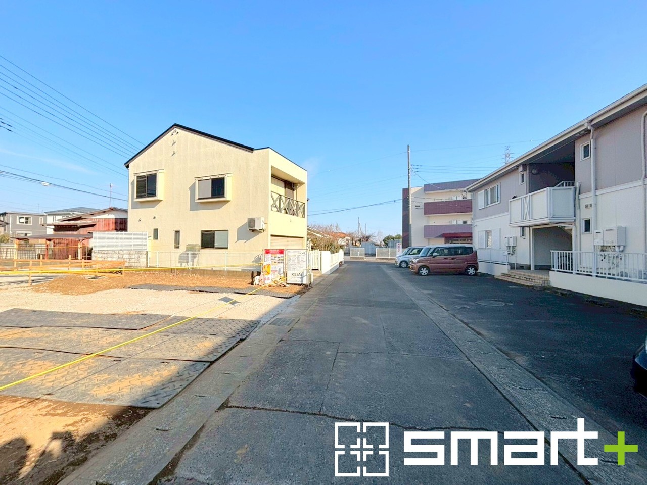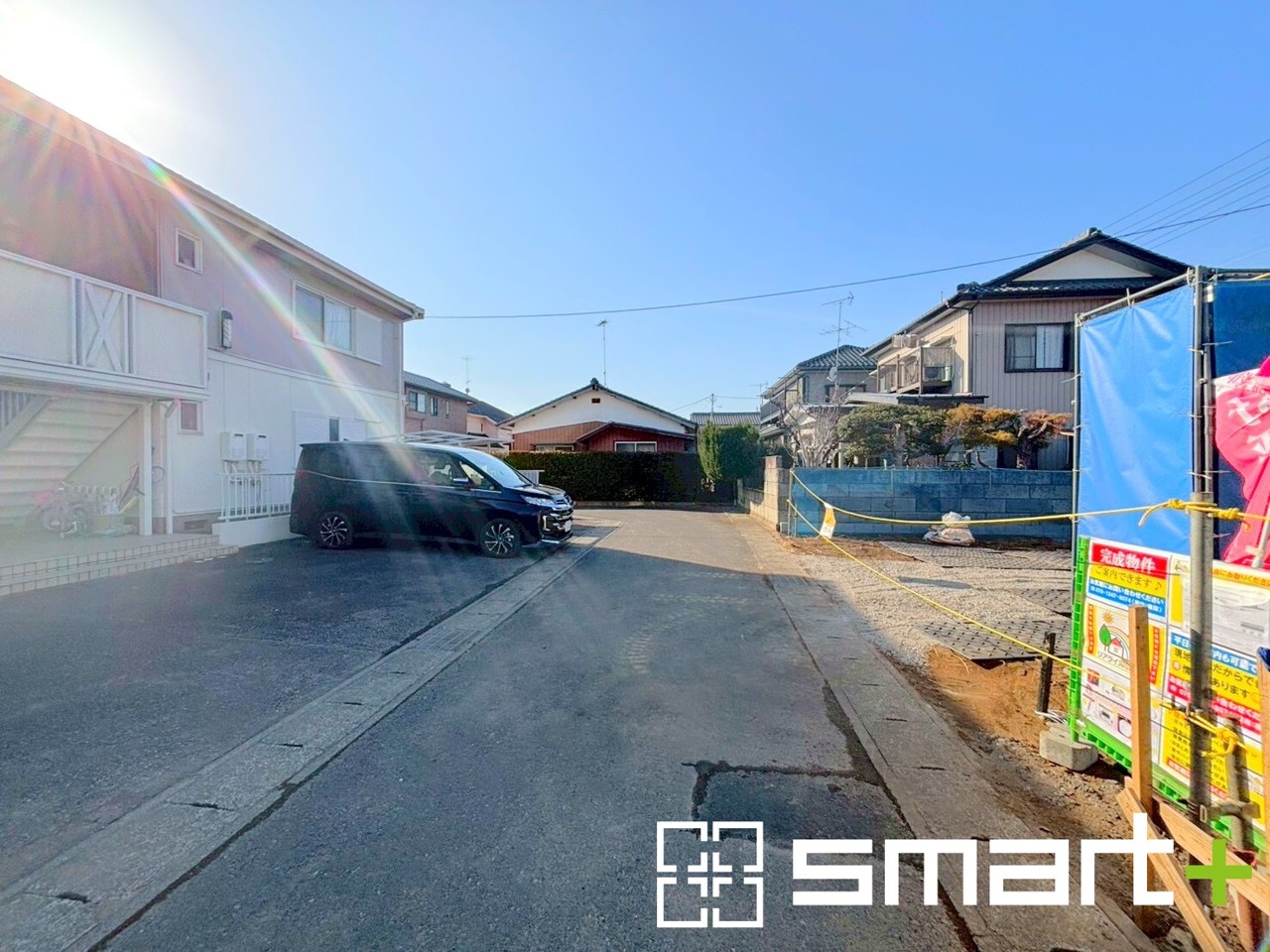 1号棟 ~十分な広さのある前面道路~ ・前面道路は約4mございますので、お車でのすれ違いも可能で余計なストレスがかかりません。 ・日々お車での移動が多い方には大切なポイントですね。