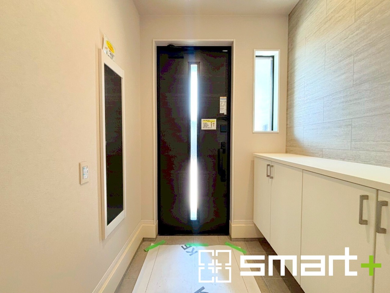~圧迫感のない明るい玄関~ ・窓に加えて玄関ドアのガラス部分からも穏やかな陽が入り、明るい玄関になります。 ・備え付けのシューズボックスはたっぷりしまえて玄関がスッキリ片付きますね。