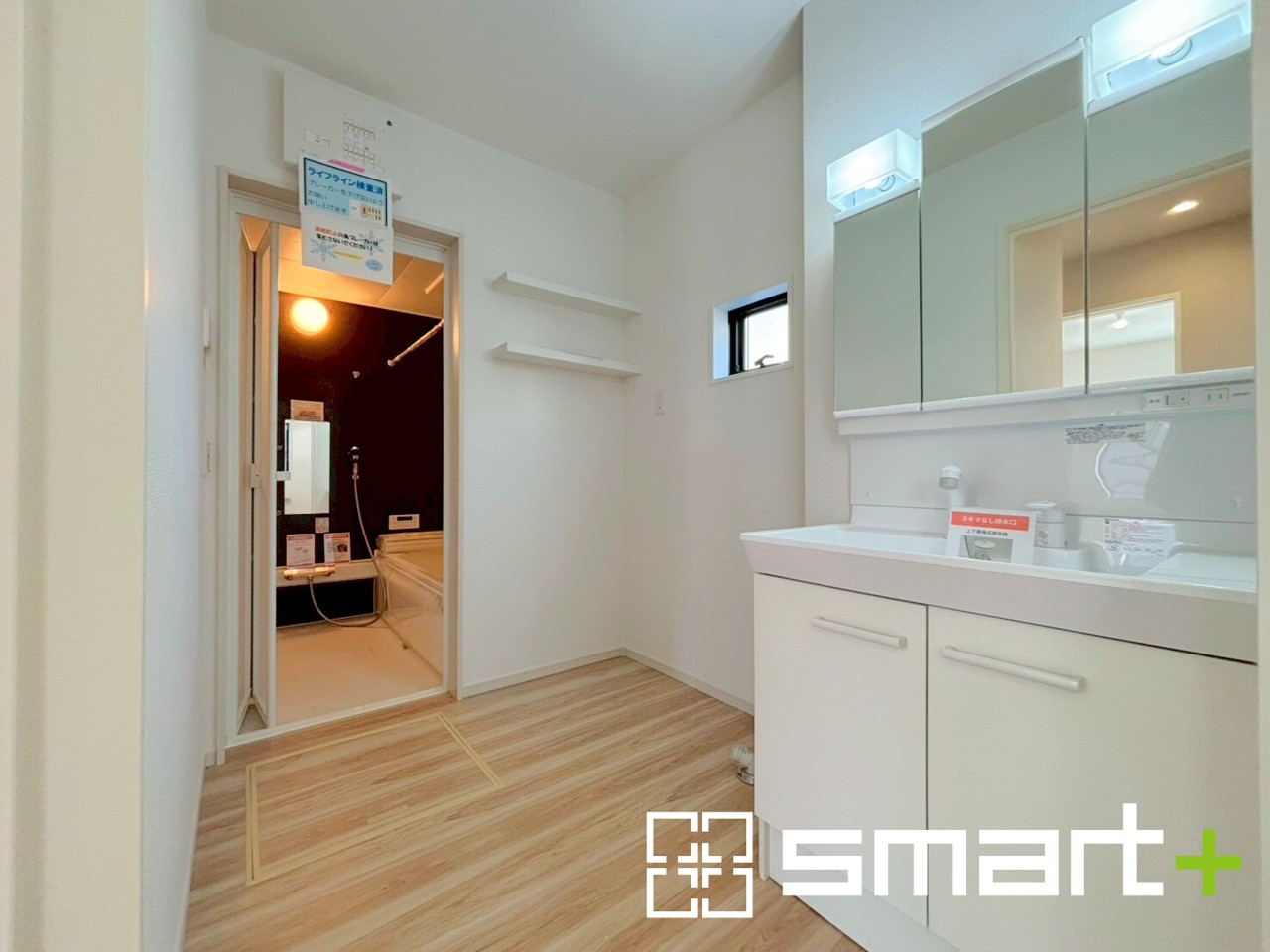 ~人気の三面鏡を採用~ ・洗面台は三面鏡仕様なので鏡の角度を変える事で頭の後ろの方までご確認可能です。 ・鏡の裏が収納になっておりますので、洗面台周りもスッキリと片付きます。