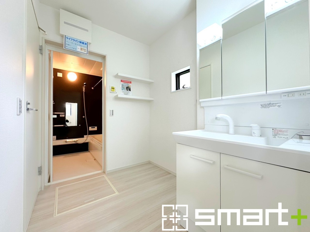 ~人気の三面鏡を採用~ ・洗面台は三面鏡仕様なので鏡の角度を変える事で頭の後ろの方までご確認可能です。 ・鏡の裏が収納になっておりますので、洗面台周りもスッキリと片付きます。