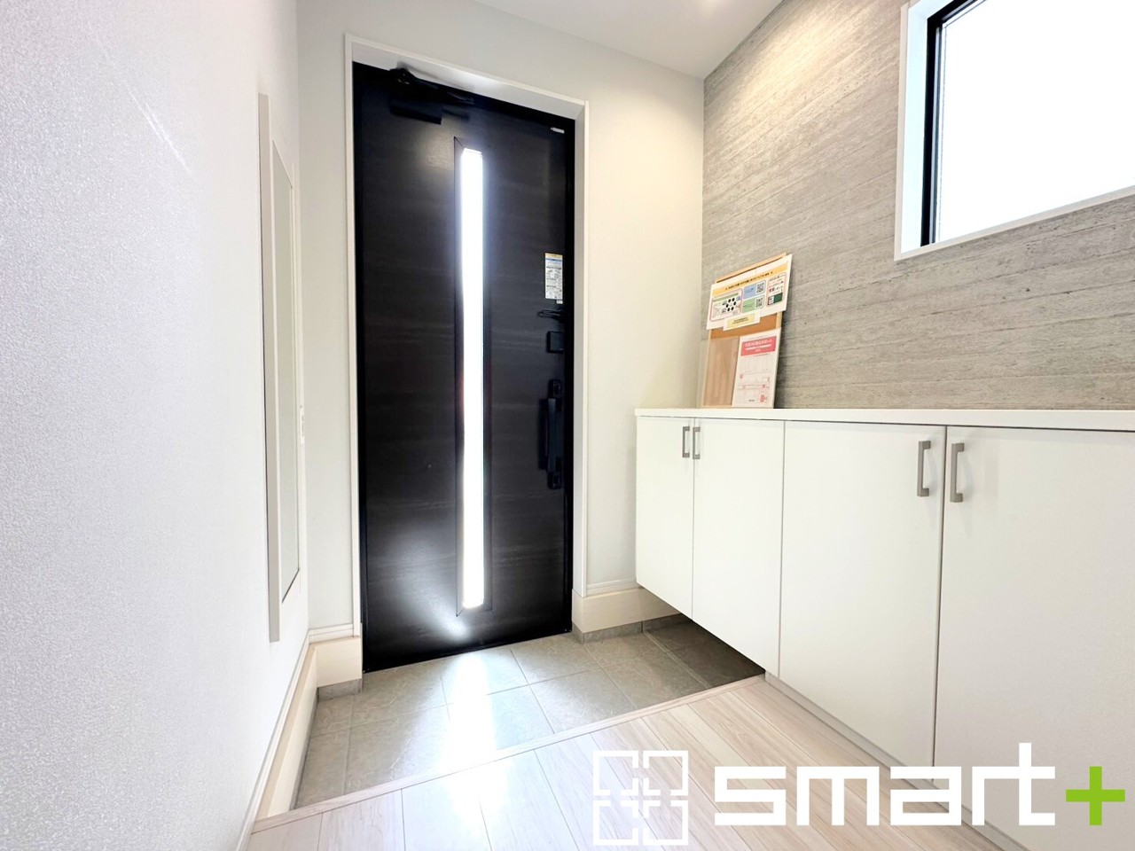 ~穏やかな陽の入る玄関~ ・玄関ドアのガラス部分に加えてシューズボックスの間に窓を設ける事で穏やかな陽の入る玄関に。 ・ご家族やご来客を明るい空間で出迎えてくれます。