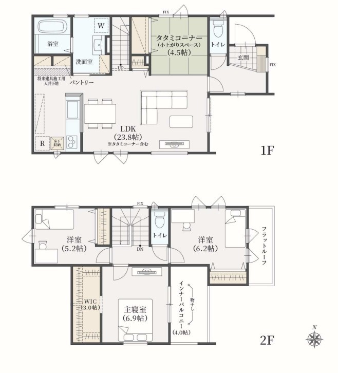 | 間取 | 3LDK + WIC、パントリー、リネン庫、リビング収納、タタミコーナー4.5帖 (LDK23.8帖、洋室6.9帖、洋室6.2帖、和室5.2帖) | ||