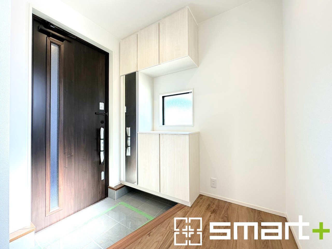 ~穏やかな陽が入る玄関~ ・窓に加えて玄関ドアのガラス部分からも穏やかな陽が入り、明るい玄関になります。 ・備え付けのシューズボックスはミラー付なのでお出かけ前のチェックに大活躍。 (1号棟)