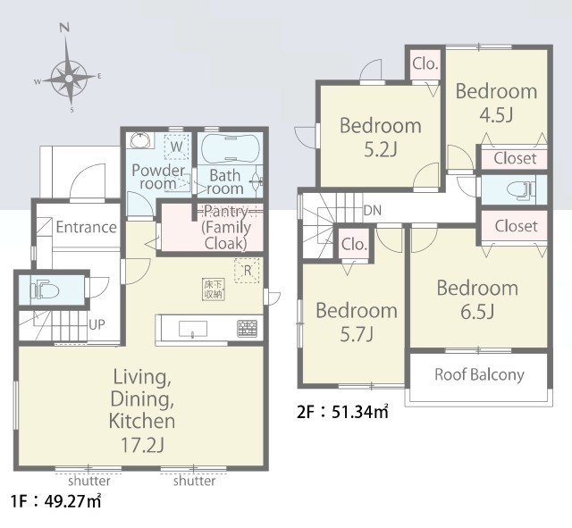 | 間取 | 4LDK + パントリー (LDK17.2帖、洋室6.5帖、洋室5.7帖、洋室5.2帖、洋室4.5帖) | ||