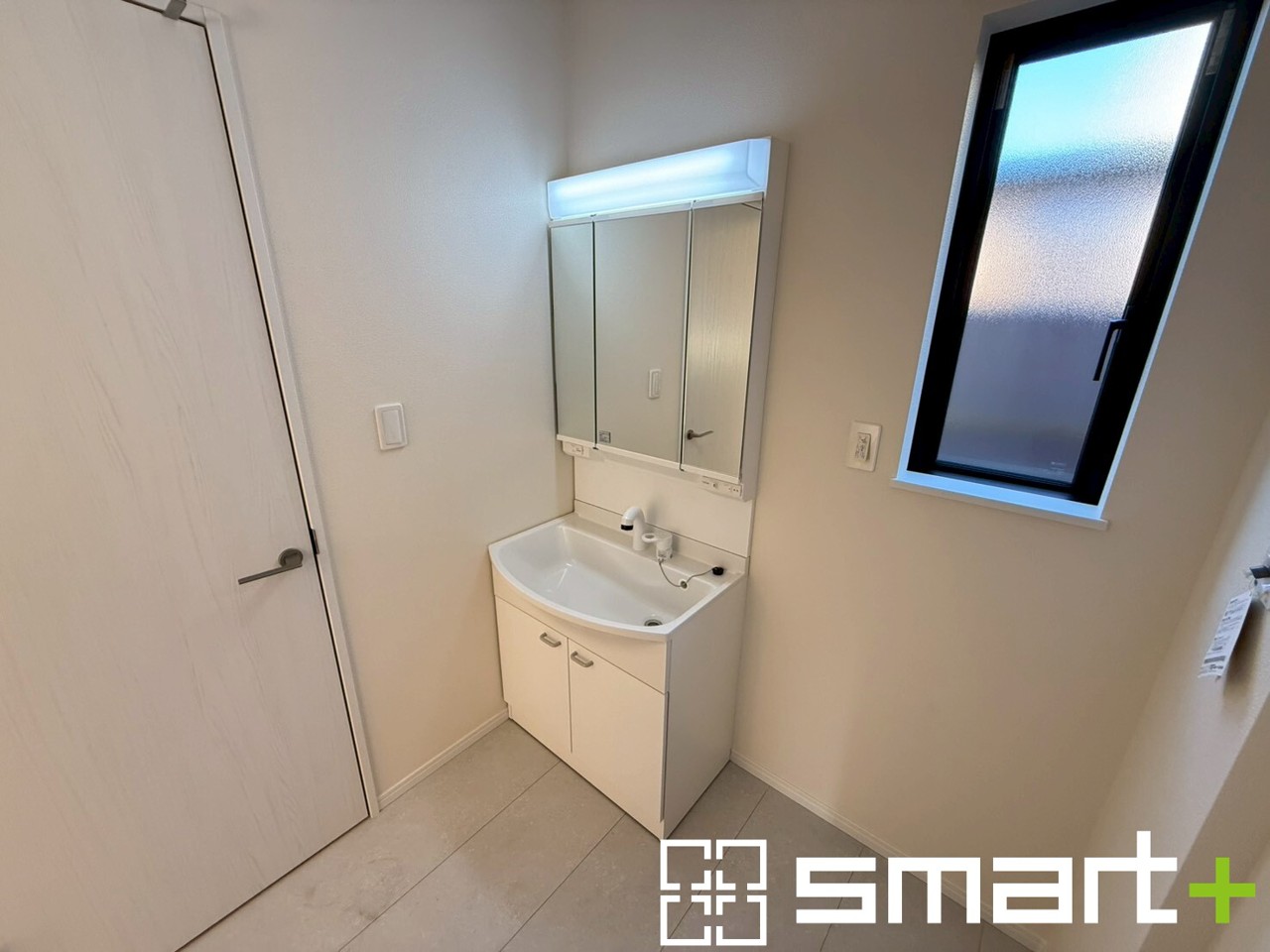 2-L号棟 ~明るい洗面スペース~ ・窓から明るい陽が入り、気持ちよく朝の支度ができますね。 ・使い勝手の良い三面鏡タイプのシャワー付き洗面化粧台。鏡の裏に収納があるので洗面台周りもスッキリ。