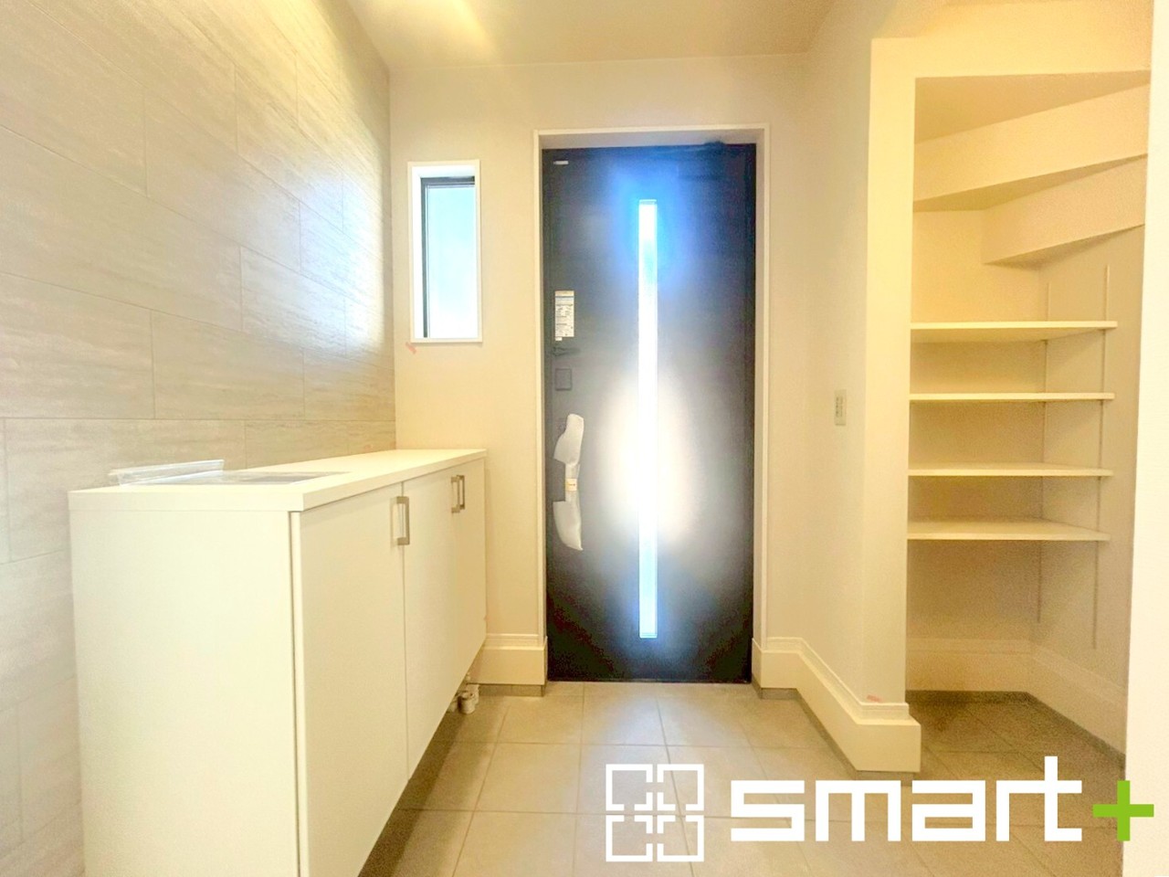 ~穏やかな陽が入る玄関~ ・窓に加えて玄関ドアのガラス部分からも穏やかな陽が入り、明るい玄関になります。 ・シューズインクローク付でベビーカーやゴルフバッグ、お子様のスポーツ用品など収納可能。
