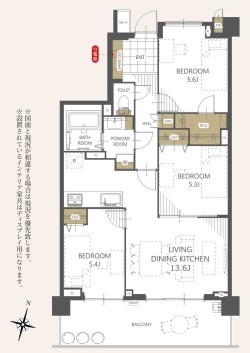 | 間取 | 3LDK+WIC (LDK13.6帖、洋室5.6帖、洋室5.4帖、洋室5.3帖) | ||