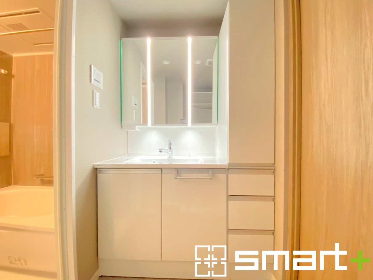 ~大きな鏡を採用した洗面台~ ・洗面台は一面の大型鏡を採用する事でホテルライクな仕様に。大型の鏡で朝の準備などもはかどりますね。 ・洗面台下のパイプスペースは収納としてご利用可能です。