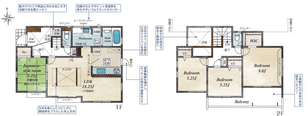 | 間取 | 4LDK + WIC、土間収納 (LDK18.25帖、洋室8帖、洋室5.25帖、洋室5.25帖、和室5.25帖) | ||
