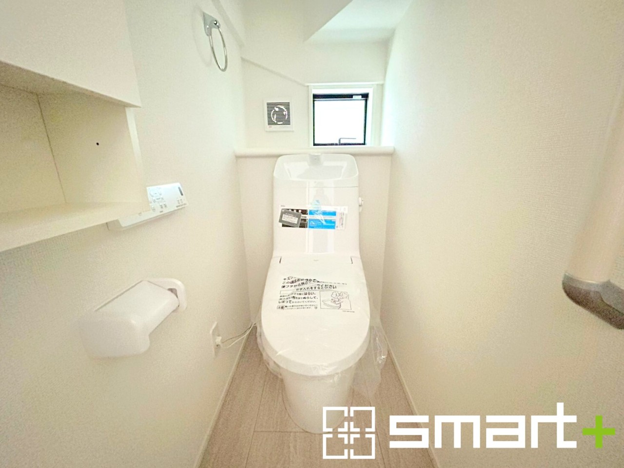 ~窓付きの明るいトイレ~ ・使用後や掃除の際に窓を開ければ、外からの新鮮な空気を取り込み素早く換気ができます。 ・埋め込み収納付きでストックや掃除用具もスッキリ片付きますね。