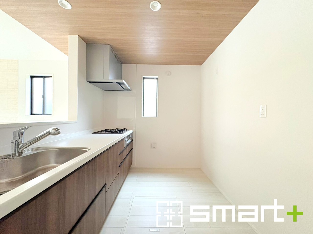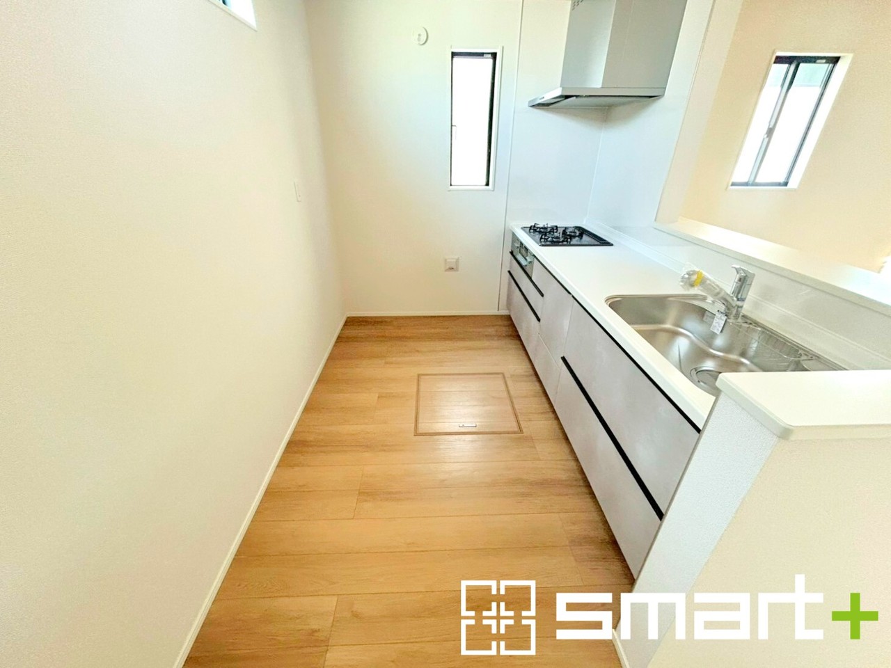 2号棟 ~使い勝手の良いシステムキッチン~ ・料理がしやすい設計のキッチンでお料理もはかどりますね。 ・もちろんキッチン下部は収納になっておりますので、フライパンなども収納可能です。