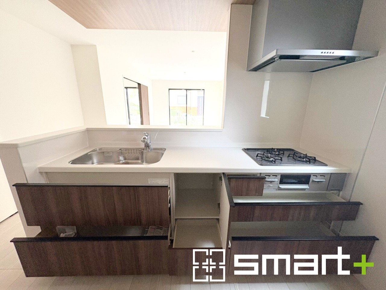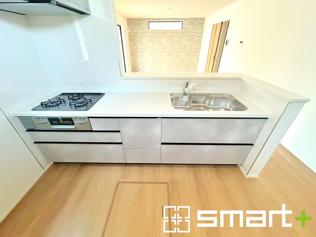 3号棟 ~使い勝手の良いシステムキッチン~ ・料理がしやすい設計のキッチンでお料理もはかどりますね。 ・もちろんキッチン下部は収納になっておりますので、フライパンなども収納可能です。