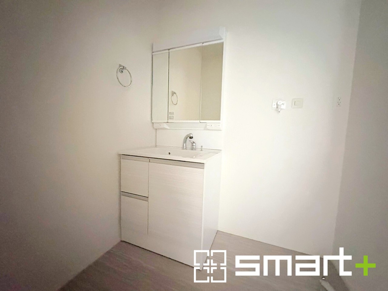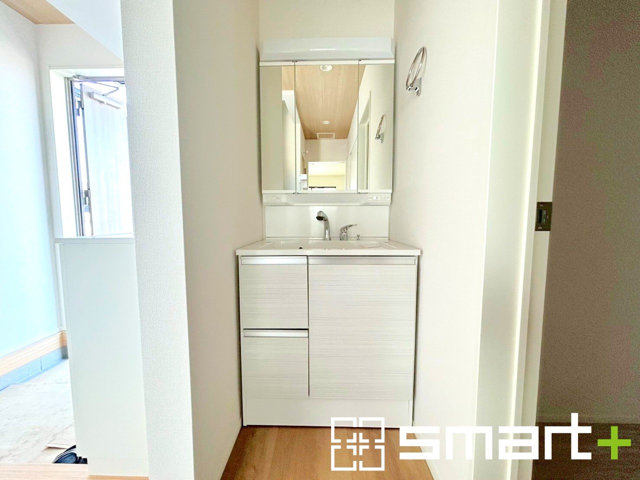 2号棟 ~人気の三面鏡を採用~ ・洗面台は三面鏡仕様なので鏡の角度を変える事で頭の後ろの方までご確認可能です。 ・鏡の裏が収納になっておりますので、洗面台周りもスッキリと片付きます。