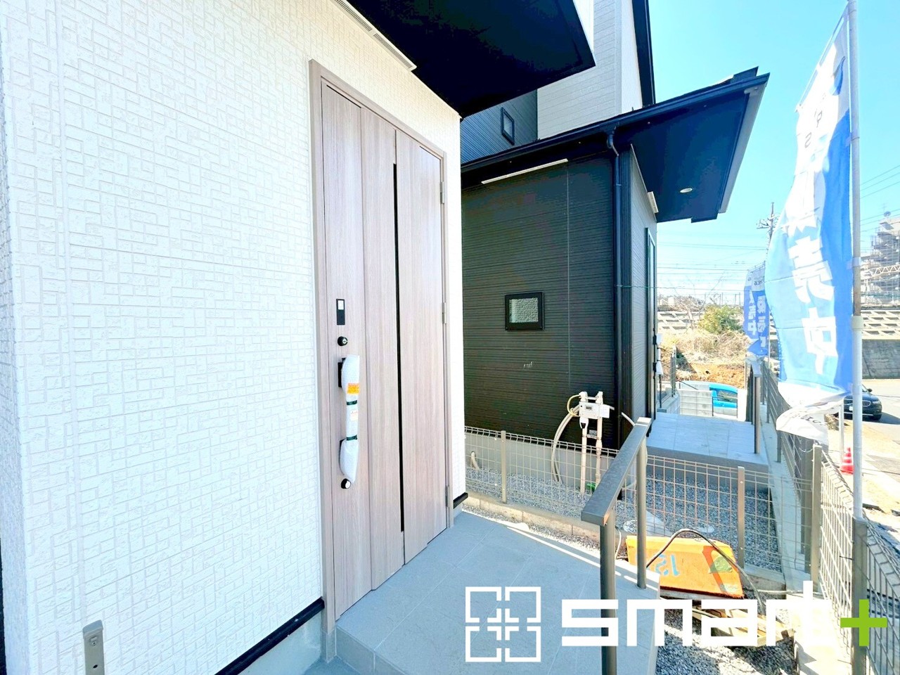 ~お住まいの顔「玄関」~ ・木のぬくもりを感じる木目調の玄関ドアを採用する事でお住まいの「顔」の印象が大きく変わりますね。 ・毎日帰宅した際に嬉しくなる仕様です。 (2号棟)