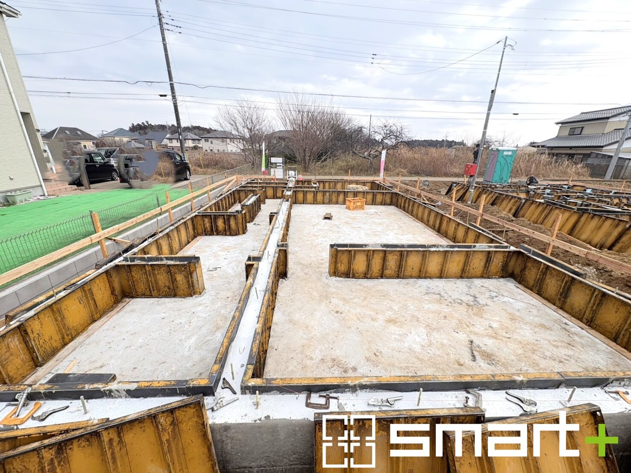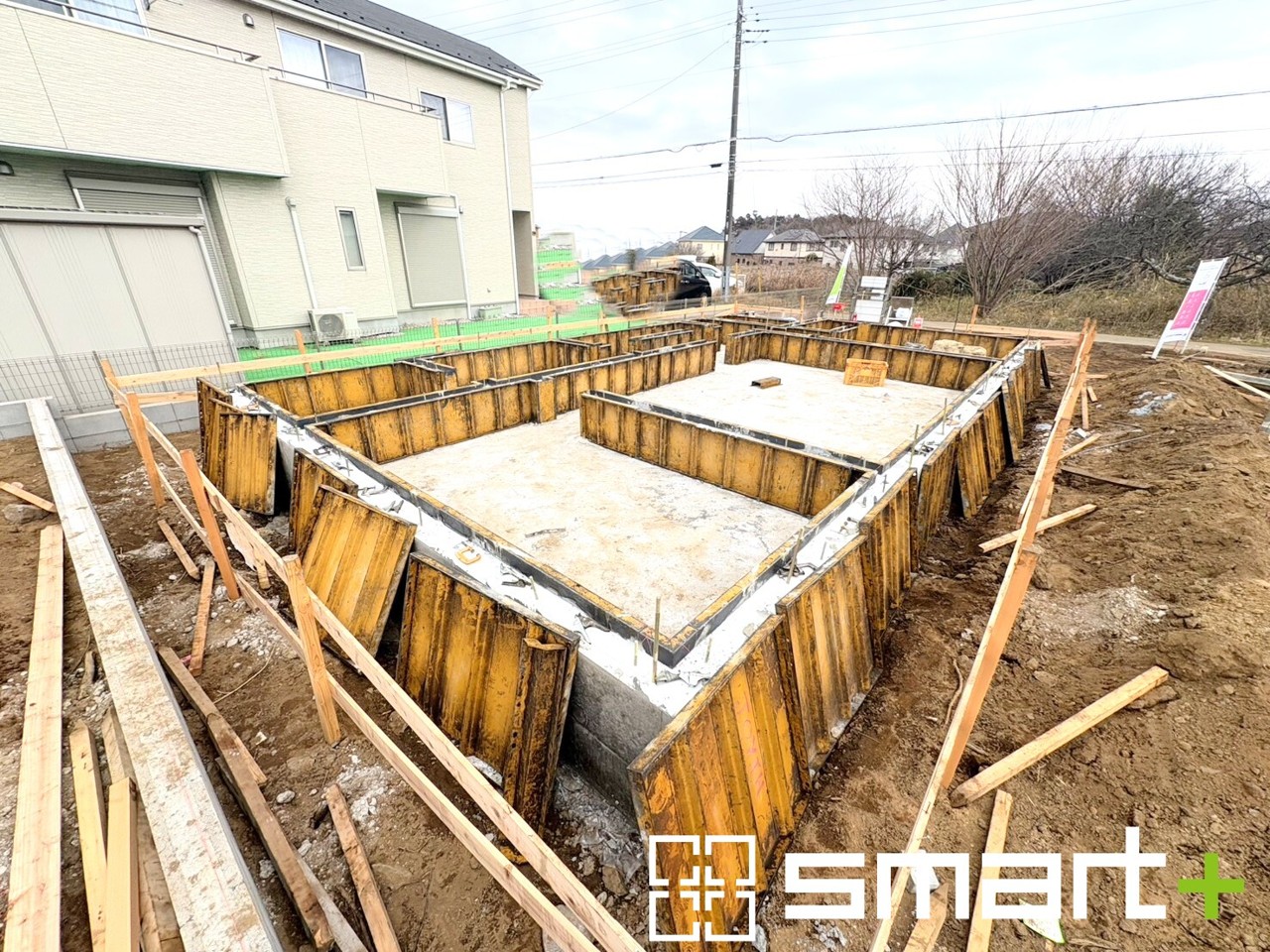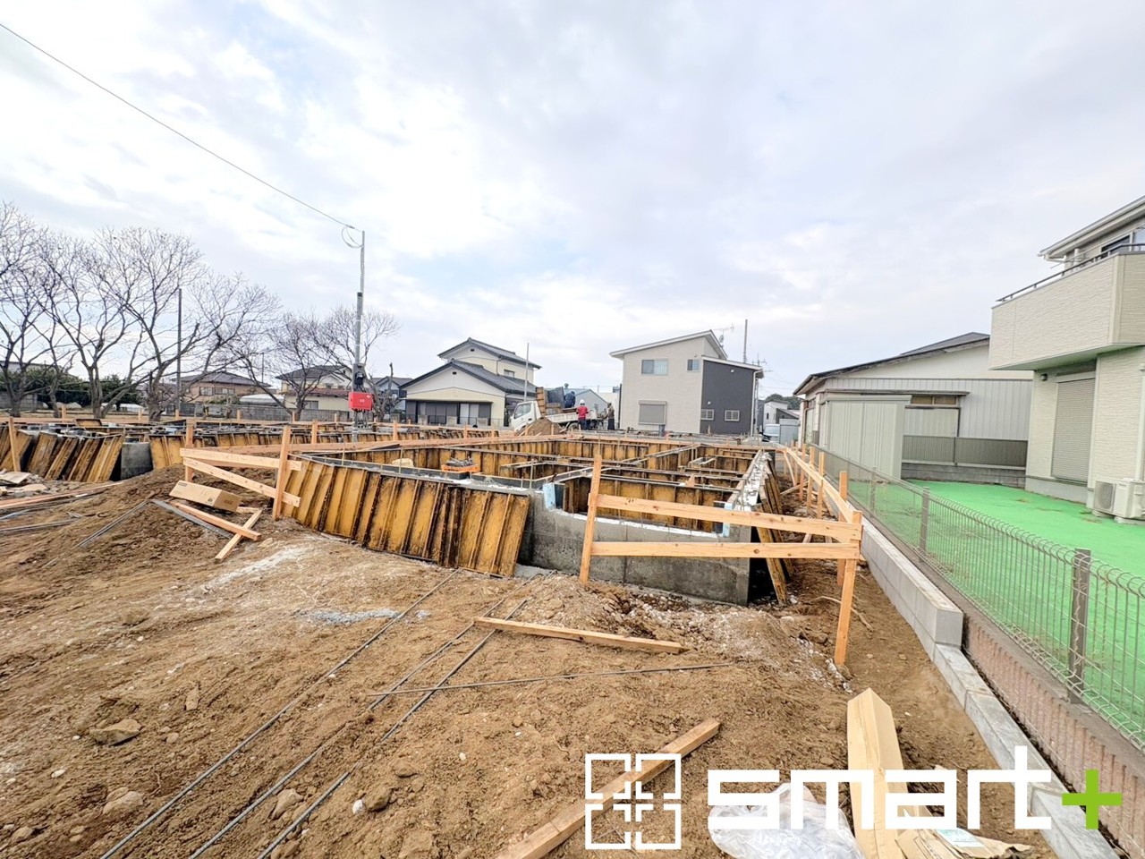 ~ベタ基礎でしっかりとした土台~ ・コンクリートの中に鉄筋を配し強度を高めた「ベタ基礎」を採用。 ・しっかりとした土台を造ったうえで、その上に建物が築造されていきます。 (1号棟)