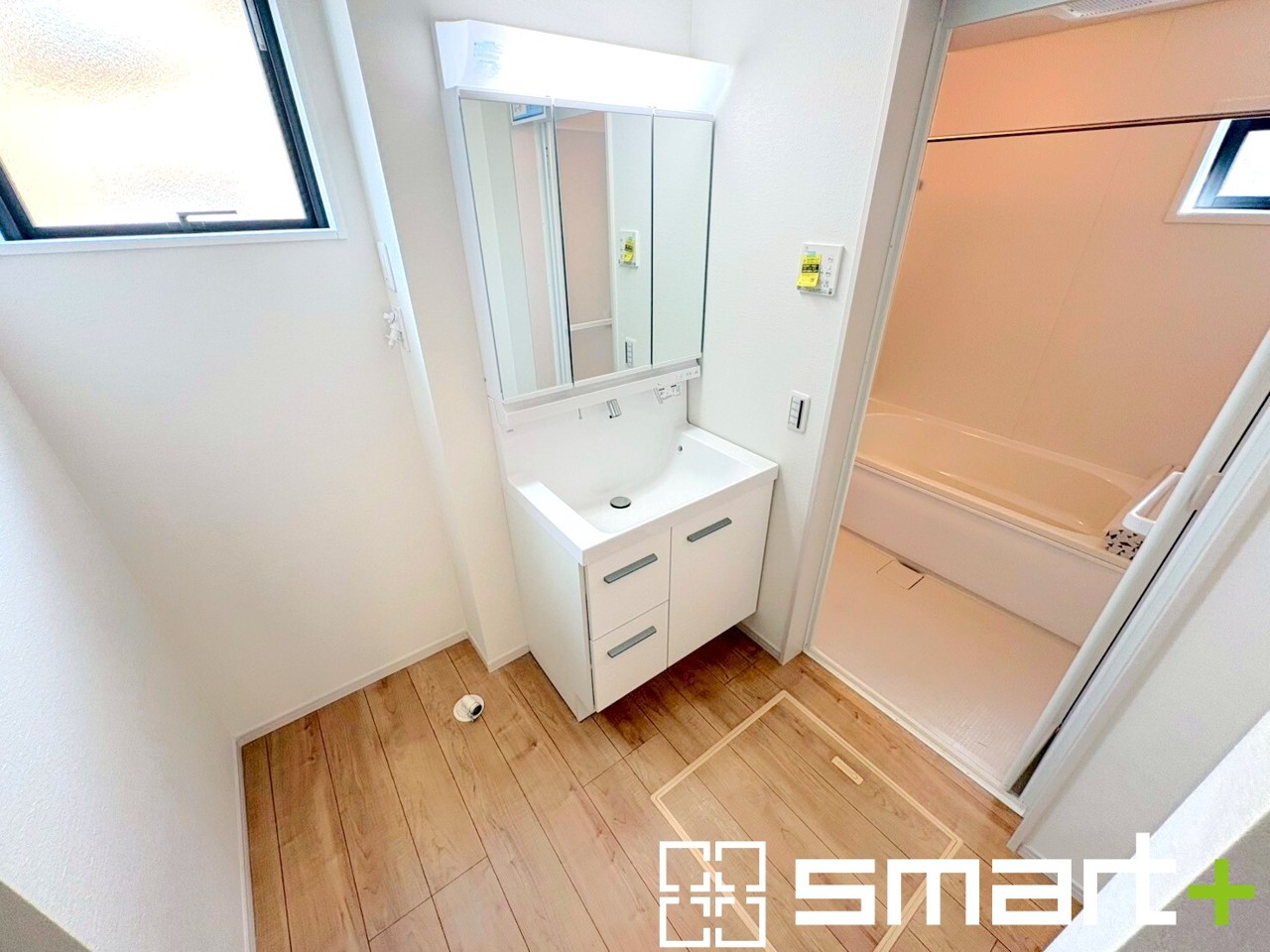 2号棟 ~明るい洗面スペース~ ・窓から明るい陽が入り、気持ちよく朝の支度ができますね。 ・使い勝手の良い三面鏡タイプのシャワー付き洗面化粧台。鏡の裏に収納があるので洗面台周りもスッキリ。